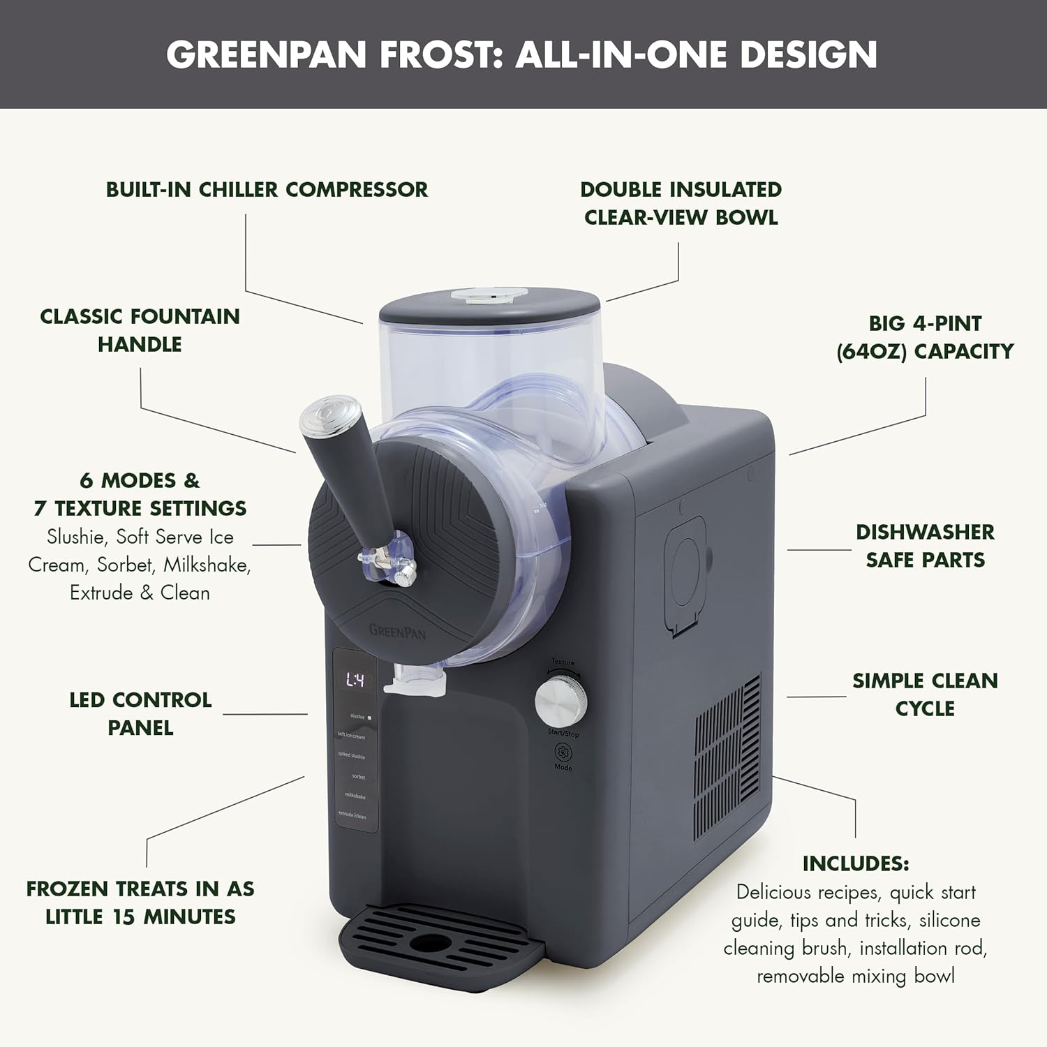 GreenPan Frost Ice Cream Machine & Frozen Drink Maker, Soft Serve, Slushie, Milkshakes & Cocktails, No Freezer Needed, 15-in-1, 7 Textures, Quiet & Rapid, Easy Clean, Family Size, Licorice Gray