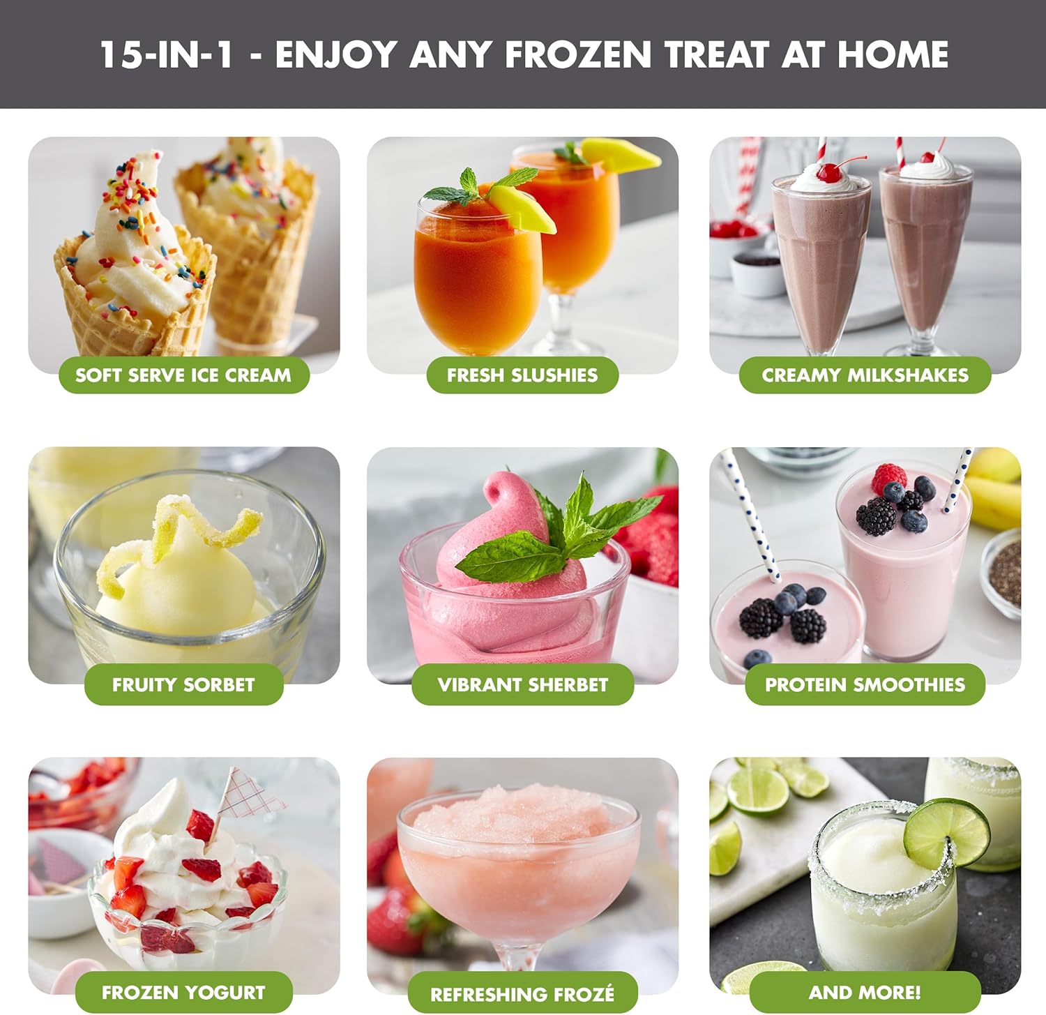 MAKE IT ALL – 15-IN-1 DESIGN: Frost lets you create everything from classic soft serve ice cream and refreshing slushies, frozé, milkshakes, smoothies, protein shakes, frozen yogurt, dairy-free/vegan ice cream, custard, sorbet, sherbet, frozen cocktails, mocktails, and more for endless possibilities at your fingertips.