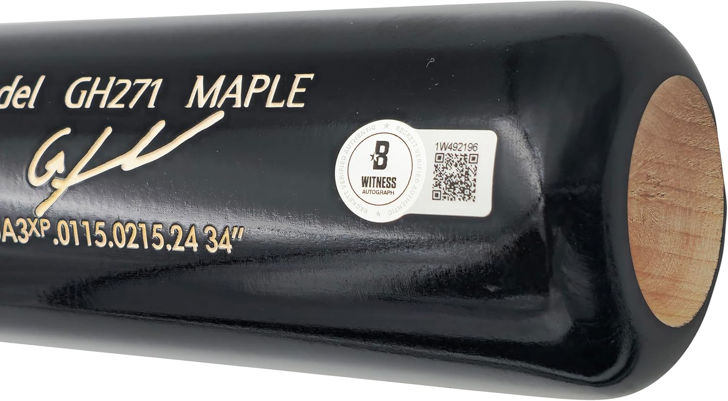This is a Black Player Model Baseball Bat that has been hand signed by Gunnar Henderson. This item was inscribed “AL ROY 23.” This item has been witnessed and certified authentic by Beckett Authentication (BAS) and comes with their tamper-proof witness sticker.