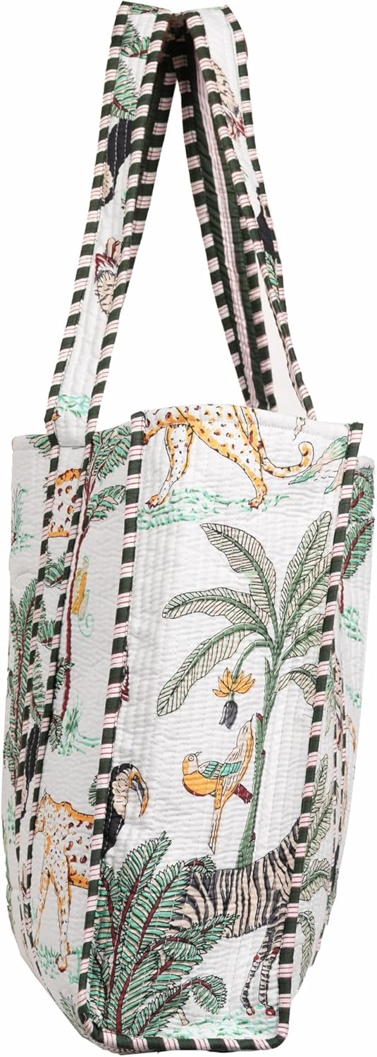 The Indian Hand Block Printed Cotton Tote Bags For Women’s Handbags from Rajasthan India. This Handbag is completely Indian Printed on good quality cotton fabric. Cotton quilted travel Bag made by Indian Artisans, this cotton quilted shopping bag is totally unique and multi purpose. Use this for your grocery or as a travel bag. Perfect to suit all. Material:- 100% Cotton Size in Inch:- Height:-15″ inch, Width:- 18″ inch, Handle- 13″ inch. Usage :- Cosmetic, Make-up, Travel, Toiletries, Medicine, Accessories, Shopping and much more. Perfect for Beach Visits / Quick Grocery runs / Extra Bag.