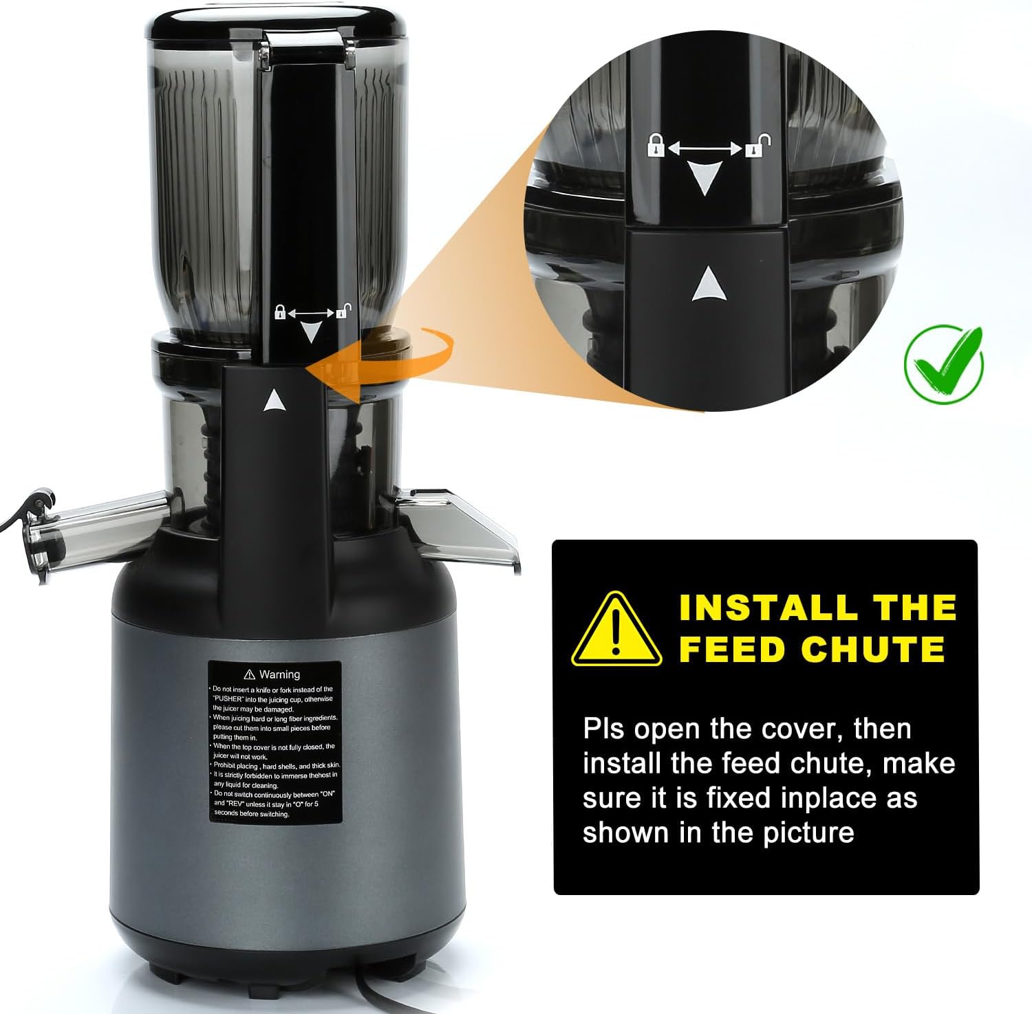 【Efficient Physical Juicing Is Beneficial For Health】Made from food-grade, BPA-liberate materials, our slow masticating juicer is designed with your health in mind. You can enjoy the pure and unprocessed quality of food with peace of mind, enjoy health while being more nutritious. Installation Tips:Put the “feeding chute” on it and rotate it clockwise to fix the “feeding chute” on the main body.(White dots on handle need to be aligned)