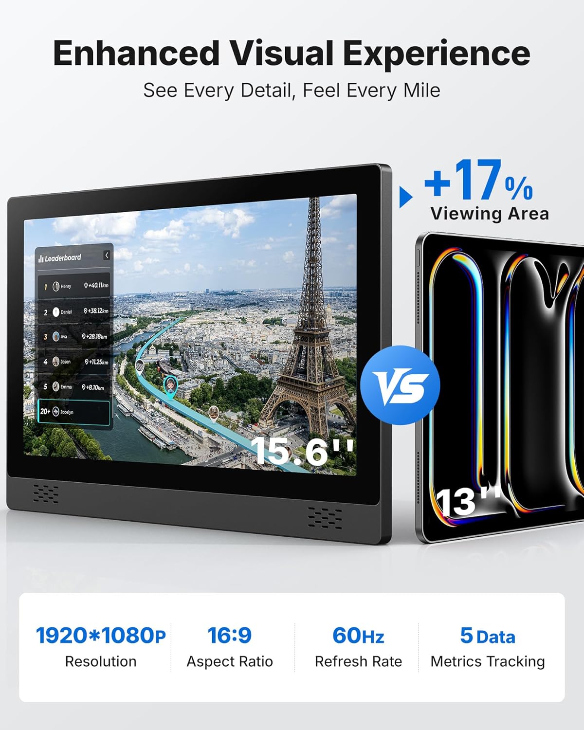 All-in-One Fitness Tracking: Enhance your workouts with 15.6” full HD (1920x1080P) fitness bike screen, offering crystal-clear visuals while tracking 5 key metrics in real time: time, speed, mileage, calories burned, and distance. Stay informed and motivated with every ride