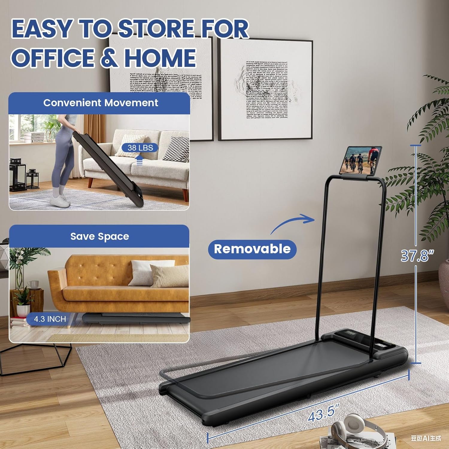 Space-Saving and Portable: Designed with a removable handrail, this walking pad fits seamlessly into compact spaces. Built-in wheels make it easy to move and store, providing convenience for any area in your home or office.