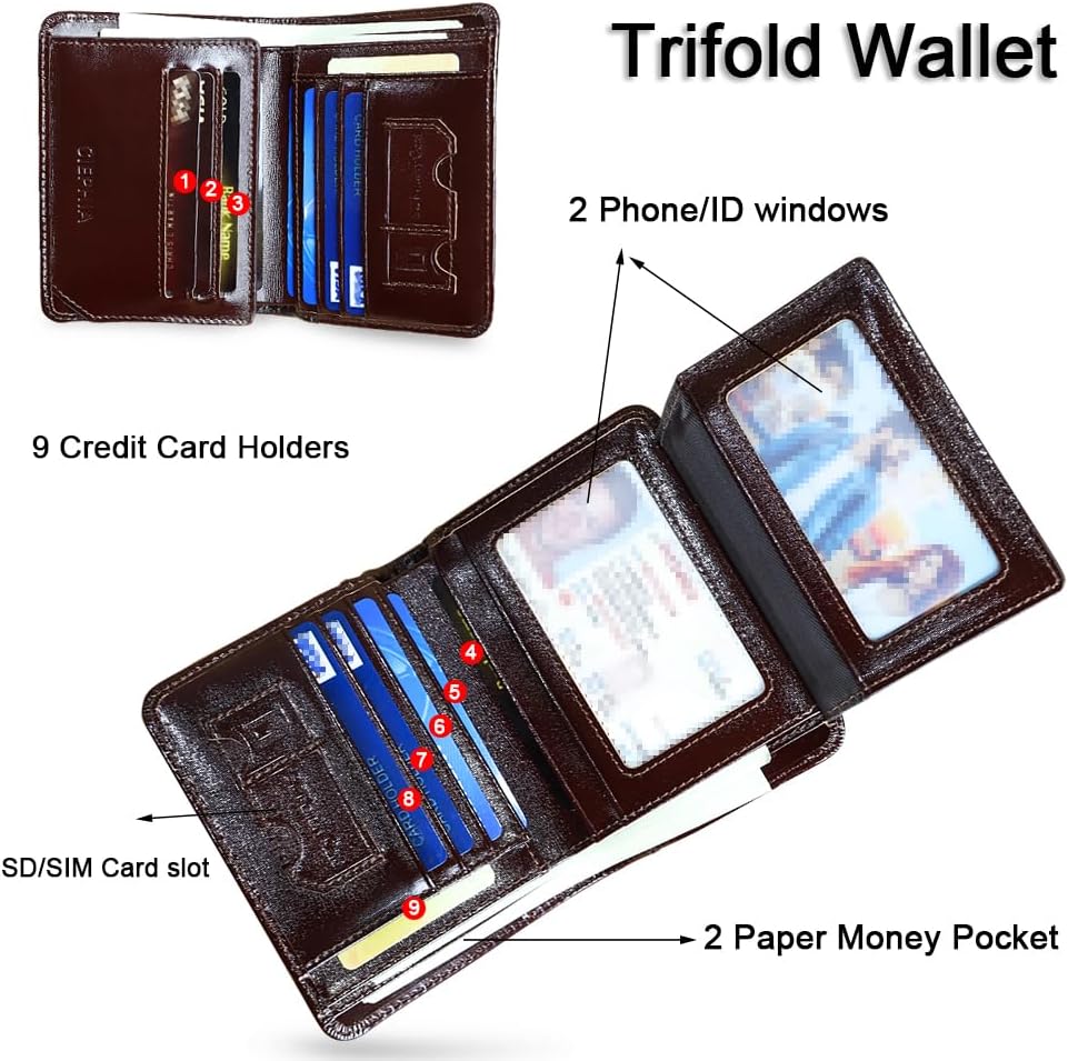 LARGE CAPACITY: Multi function trifold wallet,it can accommodate 9 credit cards to meet your daily needs, 2 ID windows to accommodate your favorite photos and driver’s licenses, and 2 large cash slots to store banknotes and receipts respectively.