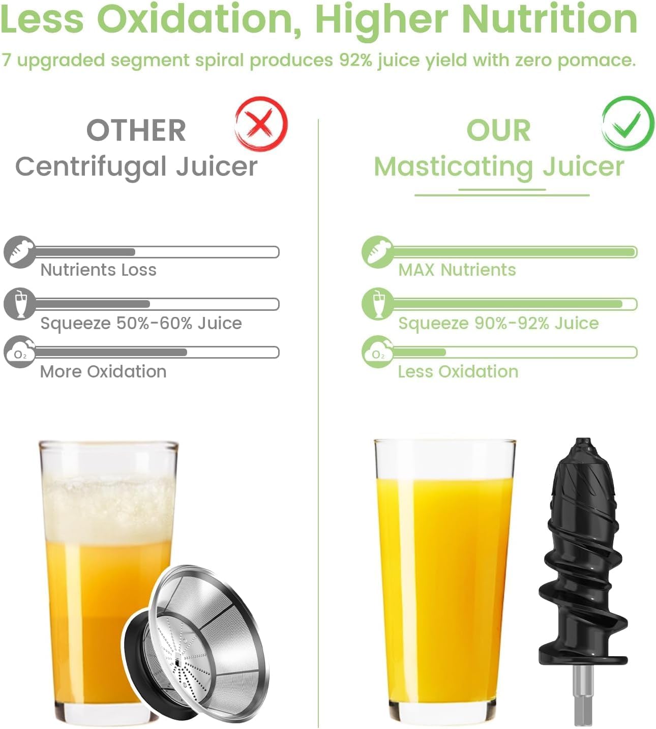 [90% Juice Yield] – The Cold Press Slow Masticating Juicers features slow cold press technology, a quieter powerful motor, and a 90% high juice yield to retain more nutrients and vitamins. The Masticating Juicer Machines uses upgraded 7 auger grinds for maximum juice yield, minimum oxidation and maximum nutrient retention.