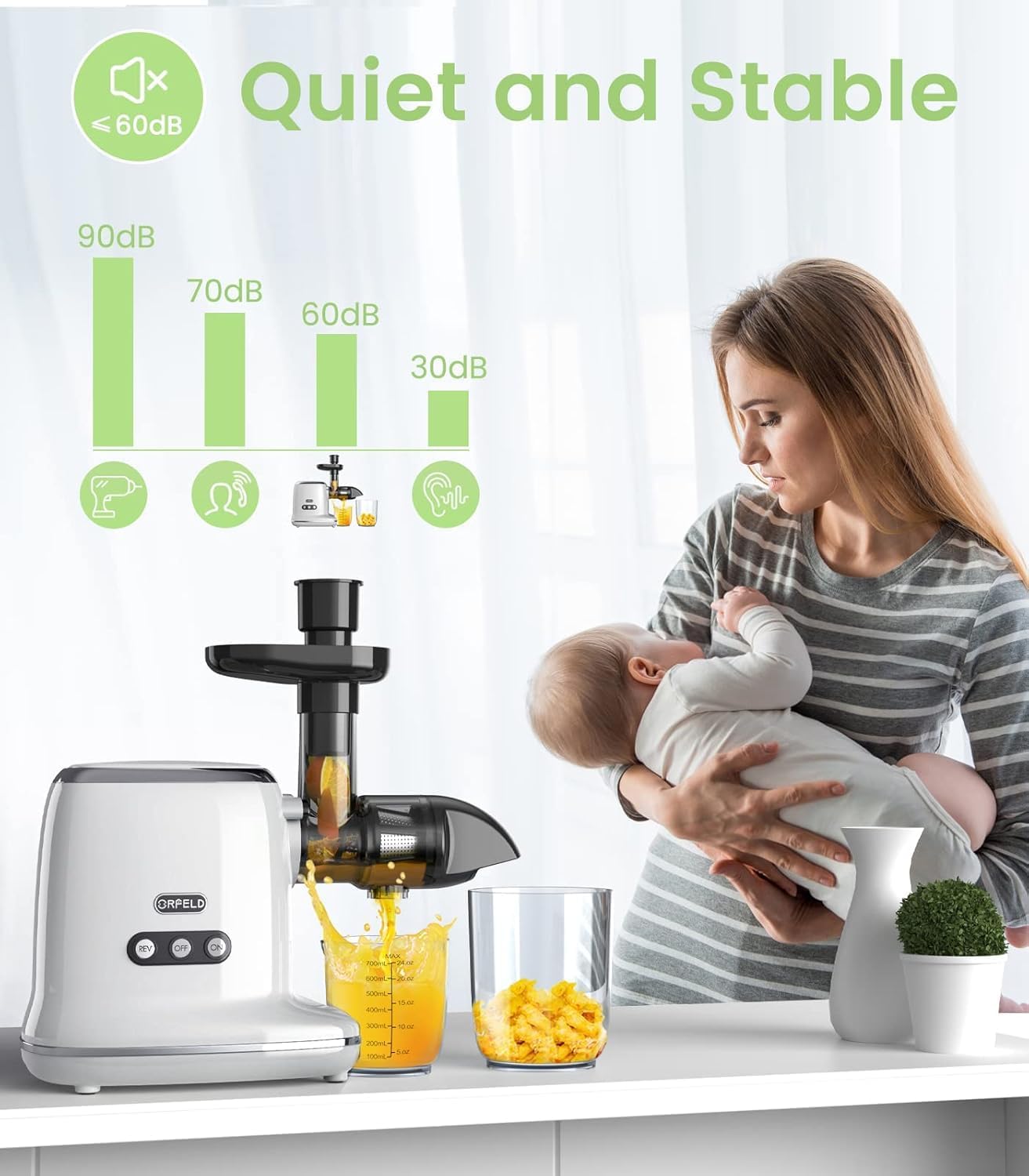 [Powerful Motor & Less Noise] – Our Cold Press Juicers has a powerful and quieter motor for really fresh juice that tastes better. During the working process the slow juicers produces less than 60DB noise which will not disturb sleep.