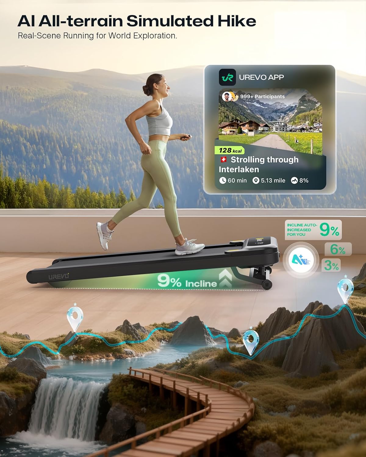 Smart Treadmill with 9% Auto Incline, Hiking and Running Walking Pad Treadmills for Home Office, Treadmill with UREVO APP, AI Powered Music Course, HIIT Programs Synced to Scenic Route, One-Click Mute