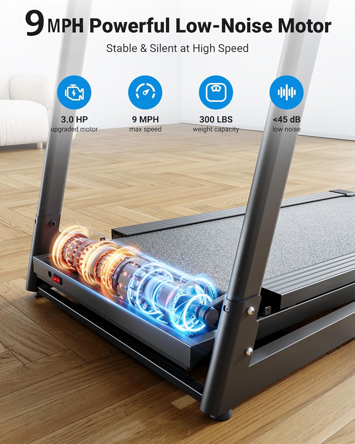 [9.0 MPH POWERFUL MOTOR] THERUN treadmill with incline features a quiet 3.0 HP motor that reaches speeds of up to 0.5-9.0 MPH. Discovering the versatility of speeds and maintaining a low noise level of just 55 dB, ensuring a quiet workout environment. This incline treadmill 300 lbs capacity supports a quiet workout environment for you, your family and even your pets