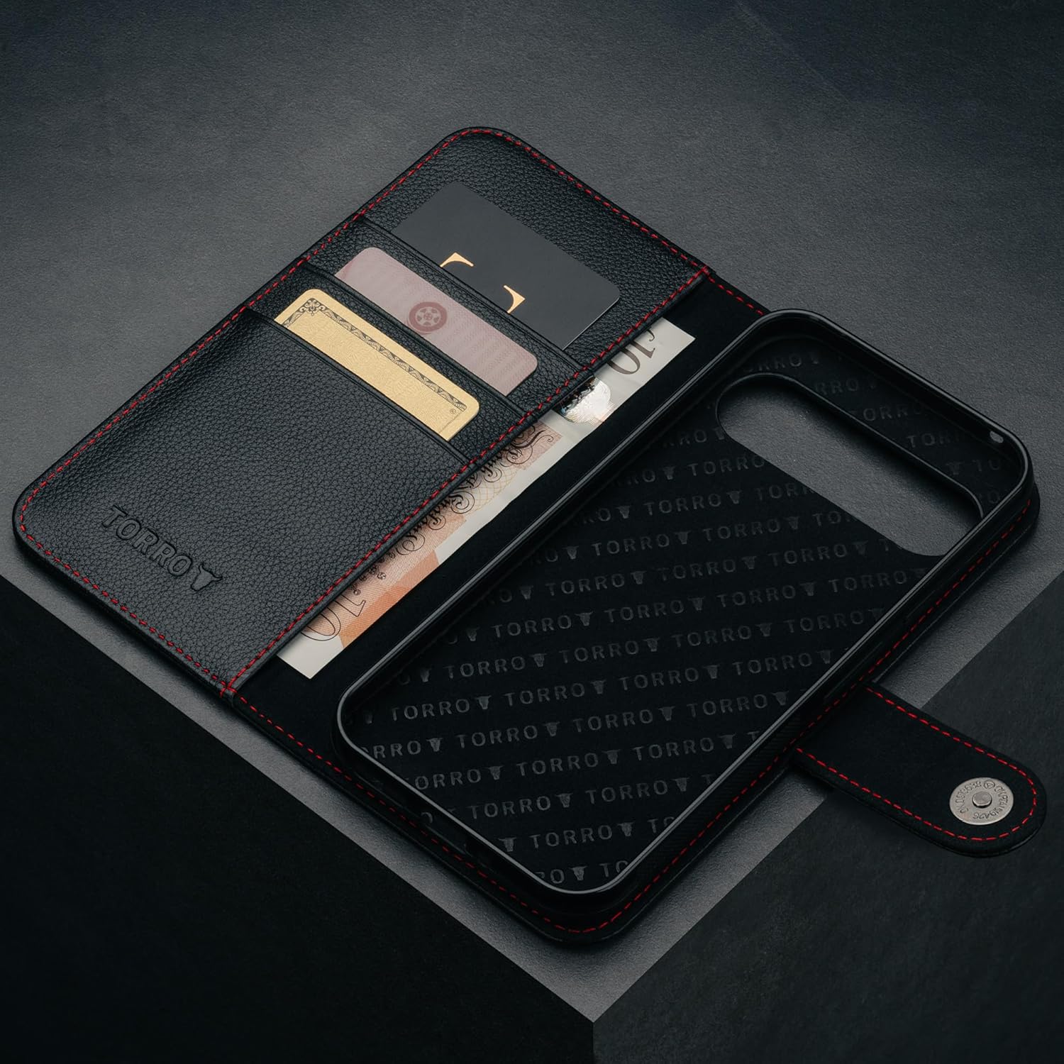 The TORRO Google Pixel 9 Pro XL case features an integrated stand function facilitating horizontal screen viewing. The case also features 3 credit card slots as well as a larger compartment for notes.