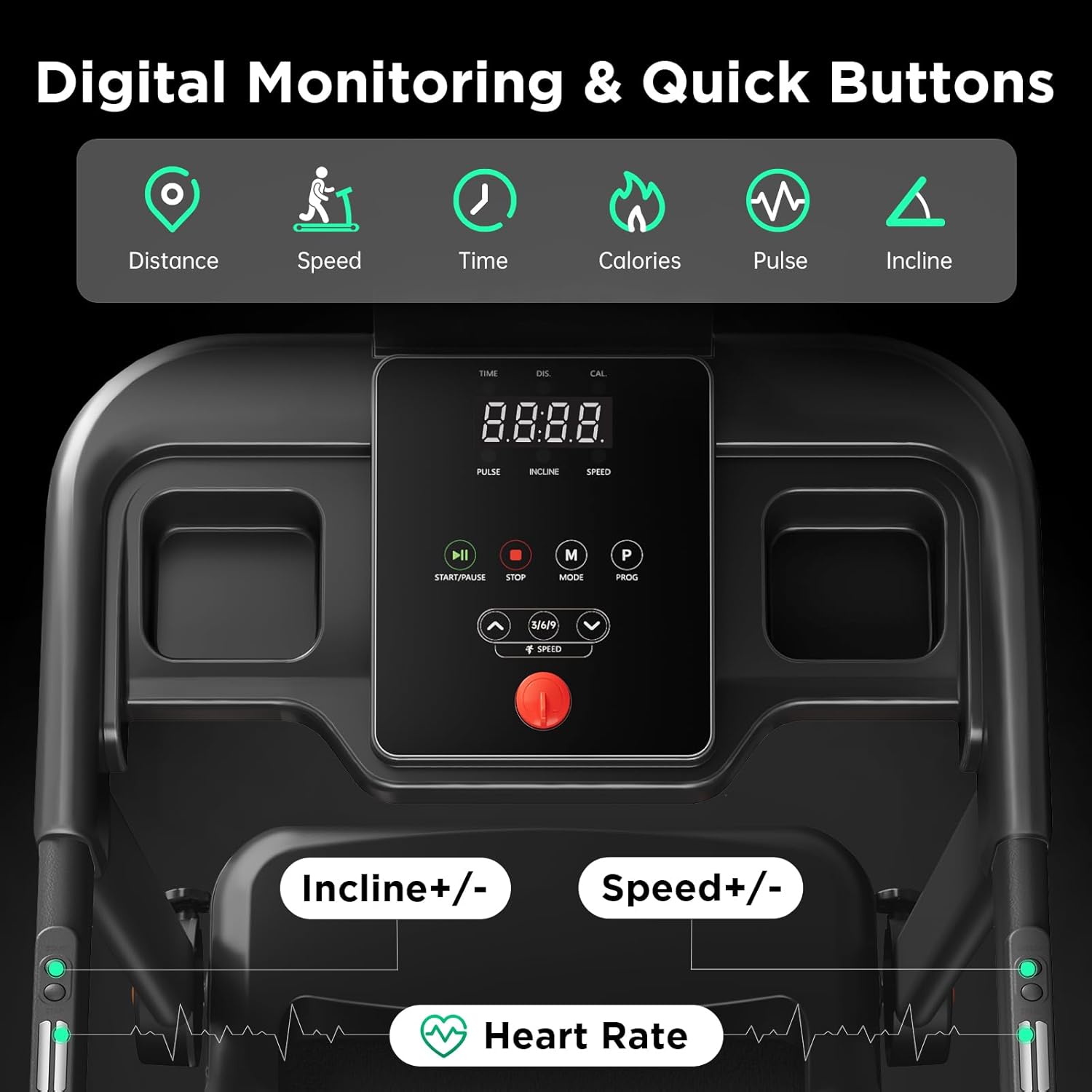 FOLDING TREADMILL WITH AUTO INCLINE: This walking treadmill Engineered for compact living, Portable treadmill featuring one-touch folding knob technology, it folds instantly in 1 second – no tools or assembly needed, Built-in transport wheels ensure effortless mobility and storage. This mini treadmill features fully auto incline adjustment (0%-15%) with precision-controlled buttons for seamless intensity changes