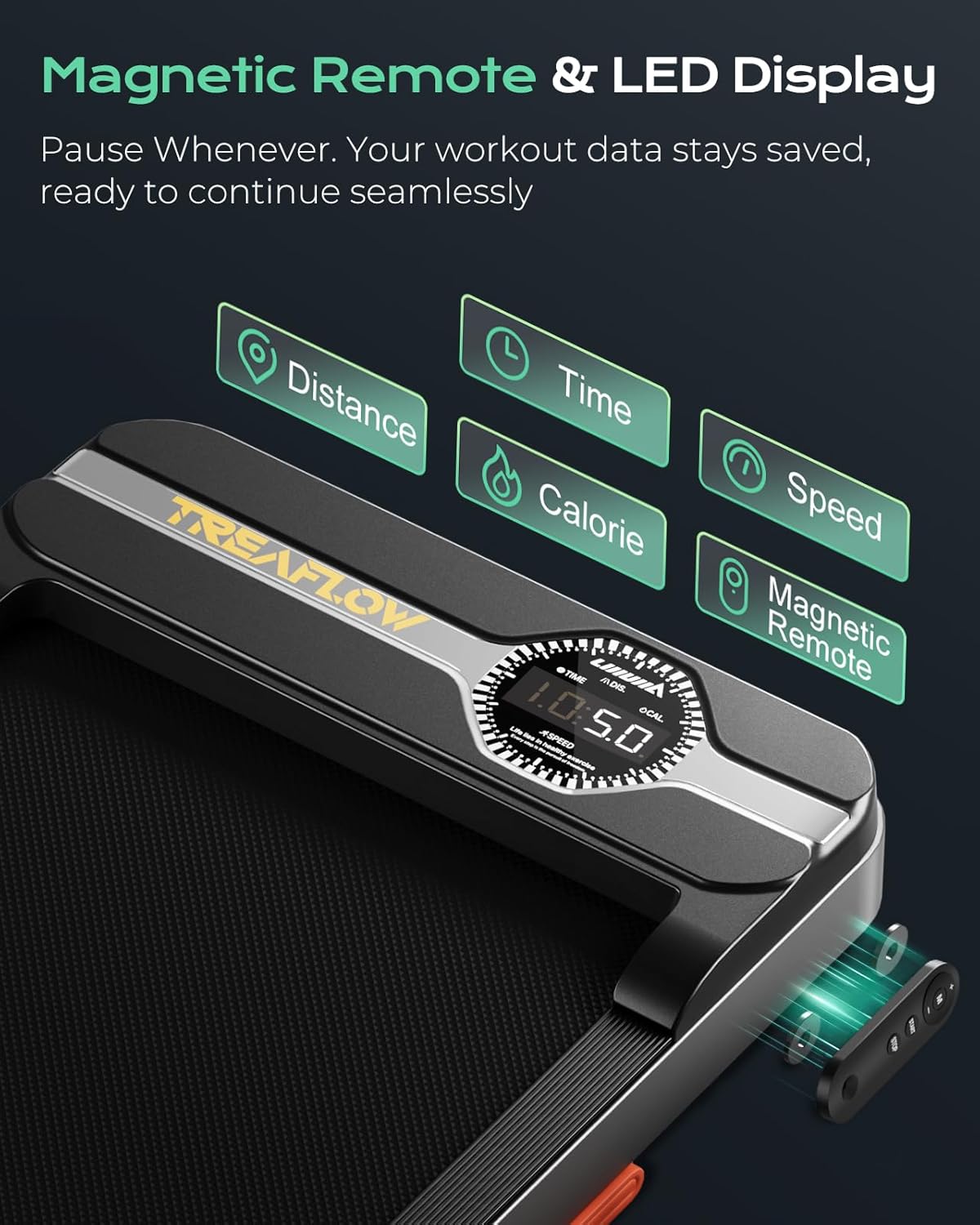 【LED Display & Remote Control】:Bright LED screen tracks speed, time, distance, and calories in real time. The included remote lets you adjust speed without bending down, making it convenient during work or leisure.