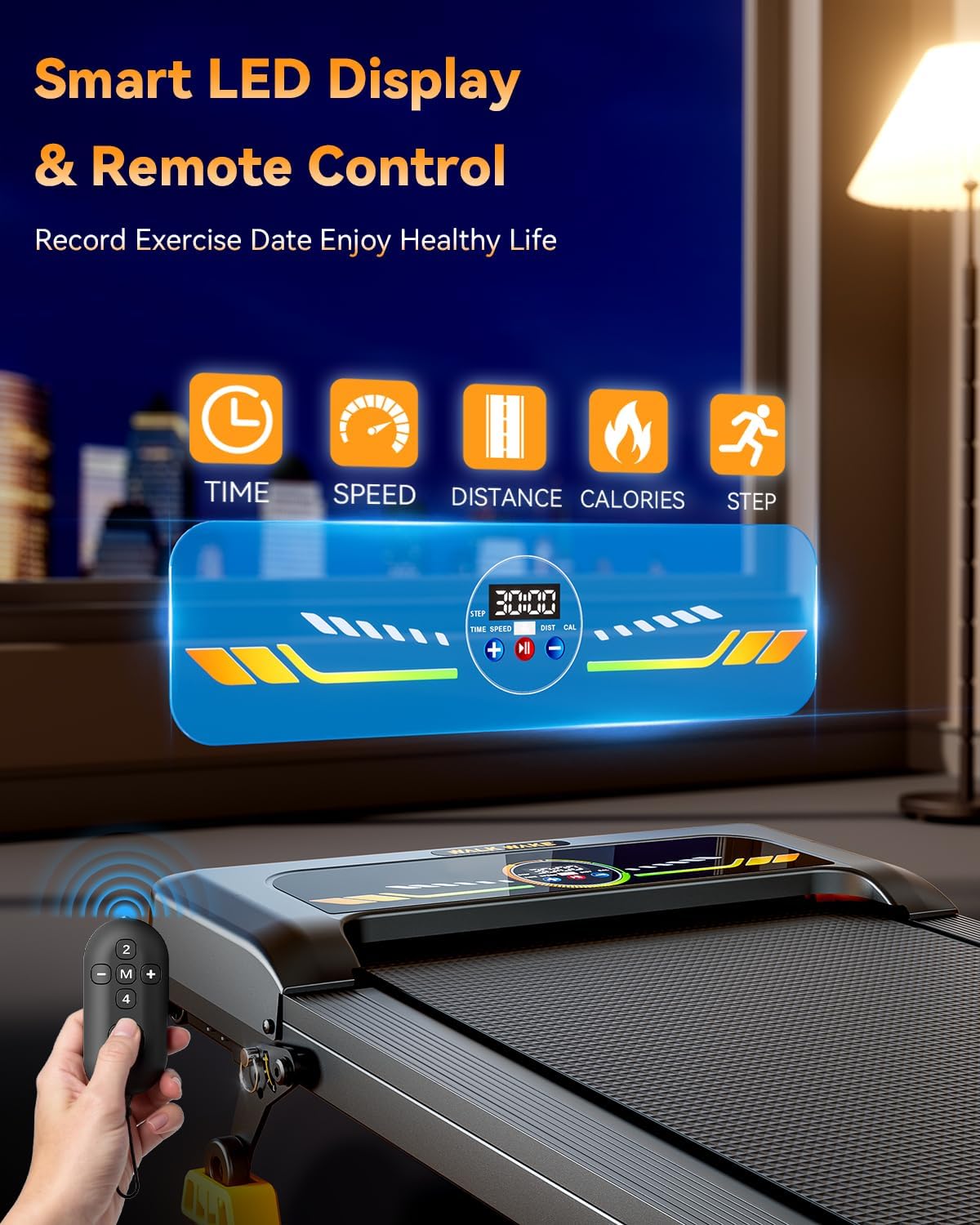 Effortless Operation Run Your Way: Seamlessly manage your treadmill with included remote control, ensuring effortless adjustments. No need to bend over; convenience is at your fingertips. The display in front of the desk walking pad on the desk clearly records calories burned, distance traveled, speed, steps, and duration, allowing you to know your exercise status at any time and enjoy the convenience and fun that technology brings.