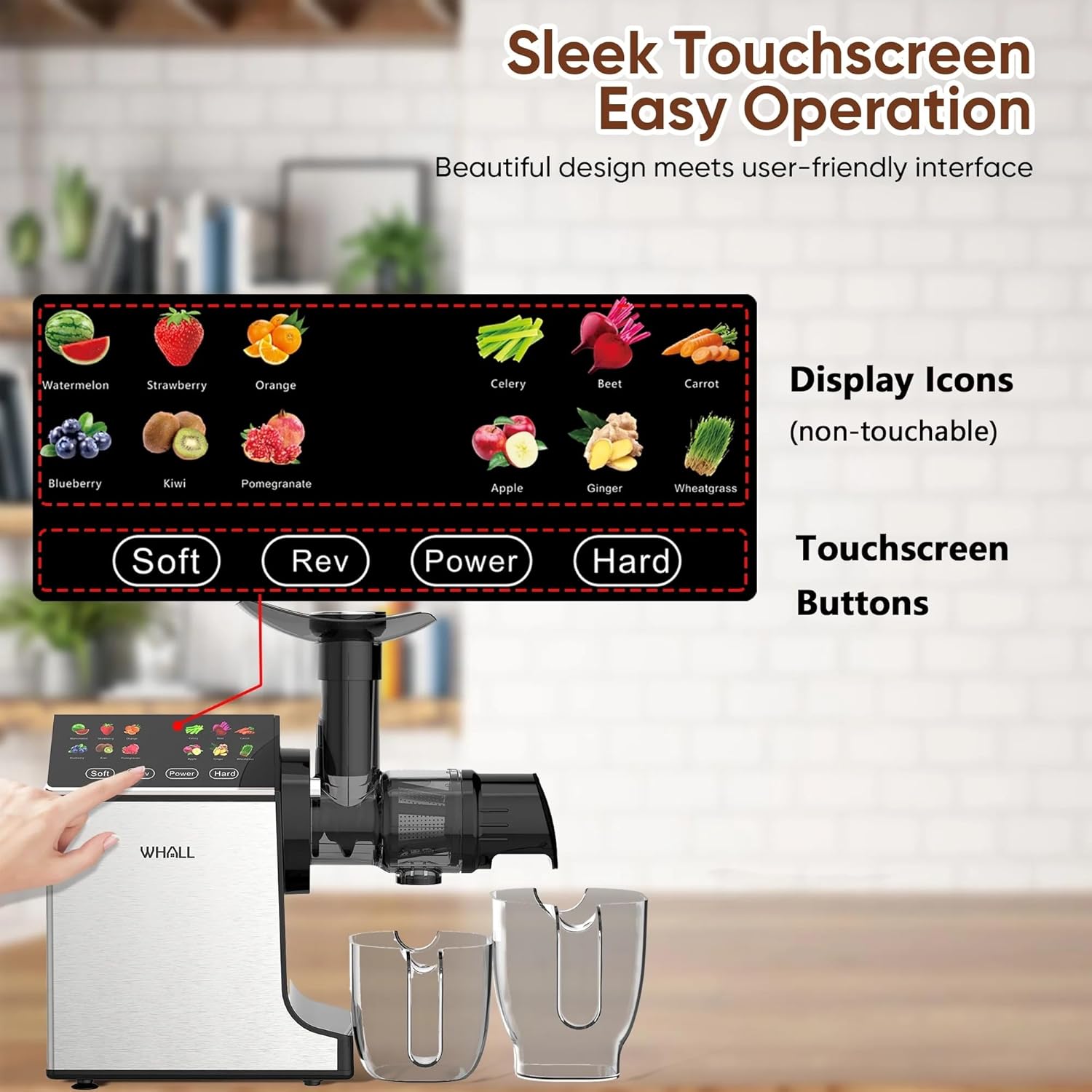 【Touch Screen Panel】:Equipped with smart touch screen panel, it is easy to complete the juicing process. Press the power button and choose the corresponding function depending on your ingredients. If you dislike the voice of touch, you can long press the power button.(Attention: Those pictures of fruits and veggies are only used for decoration and not touchable).
