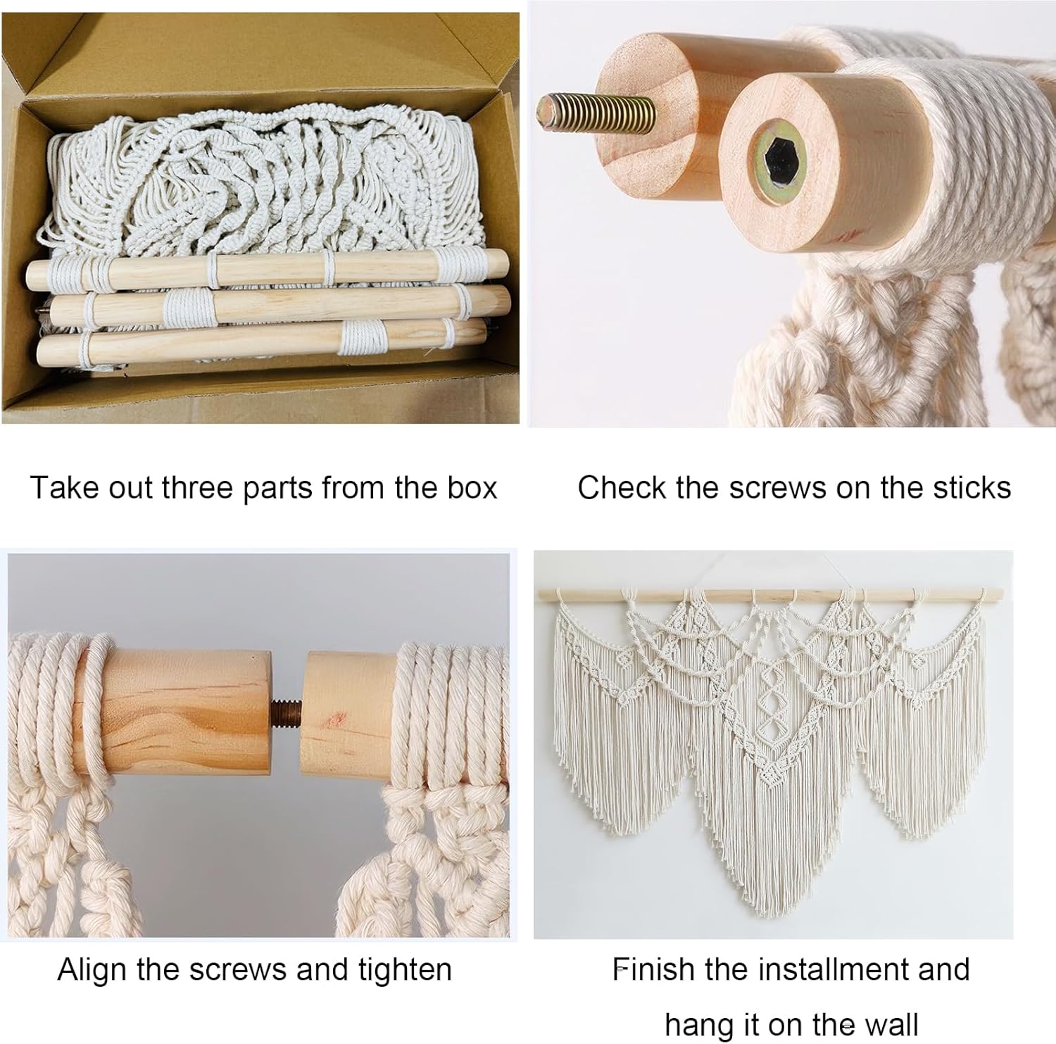 Easy to Install: The package comes with 3 separate parts of short macrame wall hangings which could be easily connected together with the screws inserted in the wood rod. Just hang it where you want to decorate and make sure it is properly hung so that it doesn’t fall down.