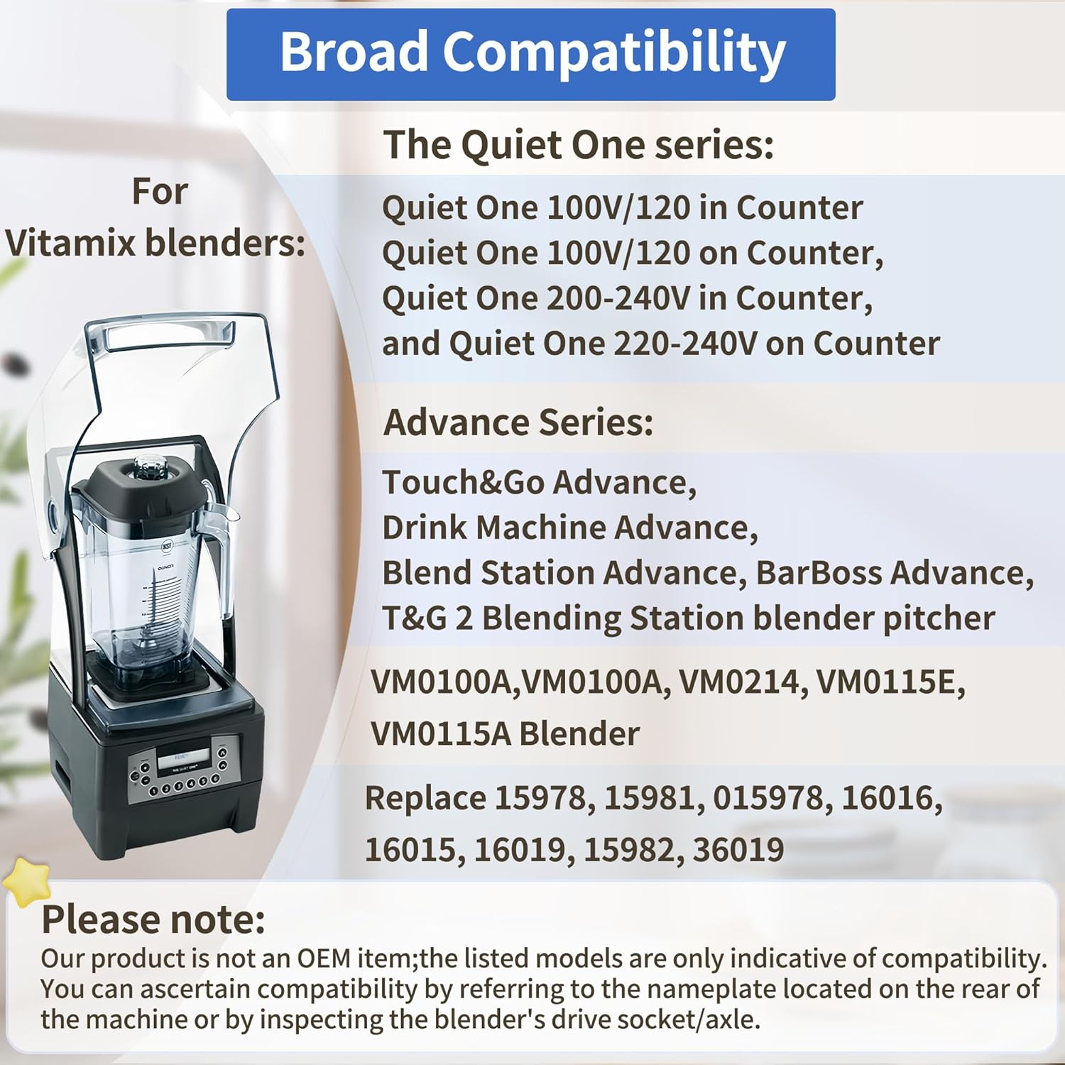 【Broad Compatibility】 Our 48oz container is compatible with Vitamix blenders, including the Quiet One, VM0145, VM0100A, VM0214, VM0115E, VM0115A, Touch&Go Advance, Drink Machine Advance, Blend Station Advance, BarBoss Advance, T&G 2 Blending Station blender pitcher. Replacement for Advance containers 15978,15981,015978, 16016, 16015, 16019, 15982, 36019. If you’re unsure about compatibility, please feel free to email us, and we will be happy to assist you in confirming it