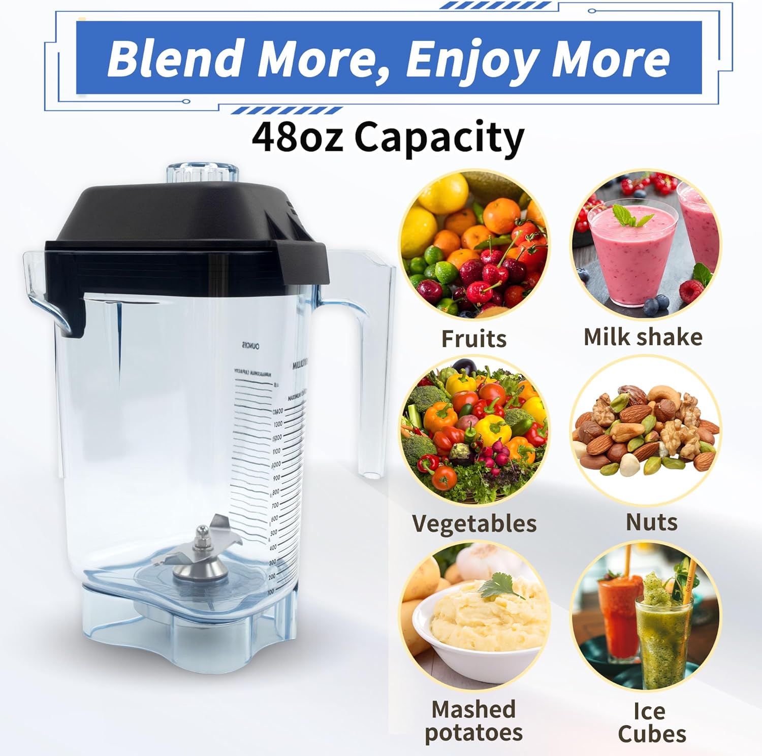 【Exceptional Design】This 48oz replacement container is designed for commercial environments, perfect for blending a variety of drinks. Equipped with a removable lid for easy ingredient additions, the ergonomic handle ensures a comfortable grip. The upgraded stainless steel blades support speeds up to 38,000 RPM, effortlessly handling various ingredients. It is ideal for making smoothies, milkshakes, juices, soups, nut butters, and more, making it an essential tool for kitchens, bars, and coffee shops
