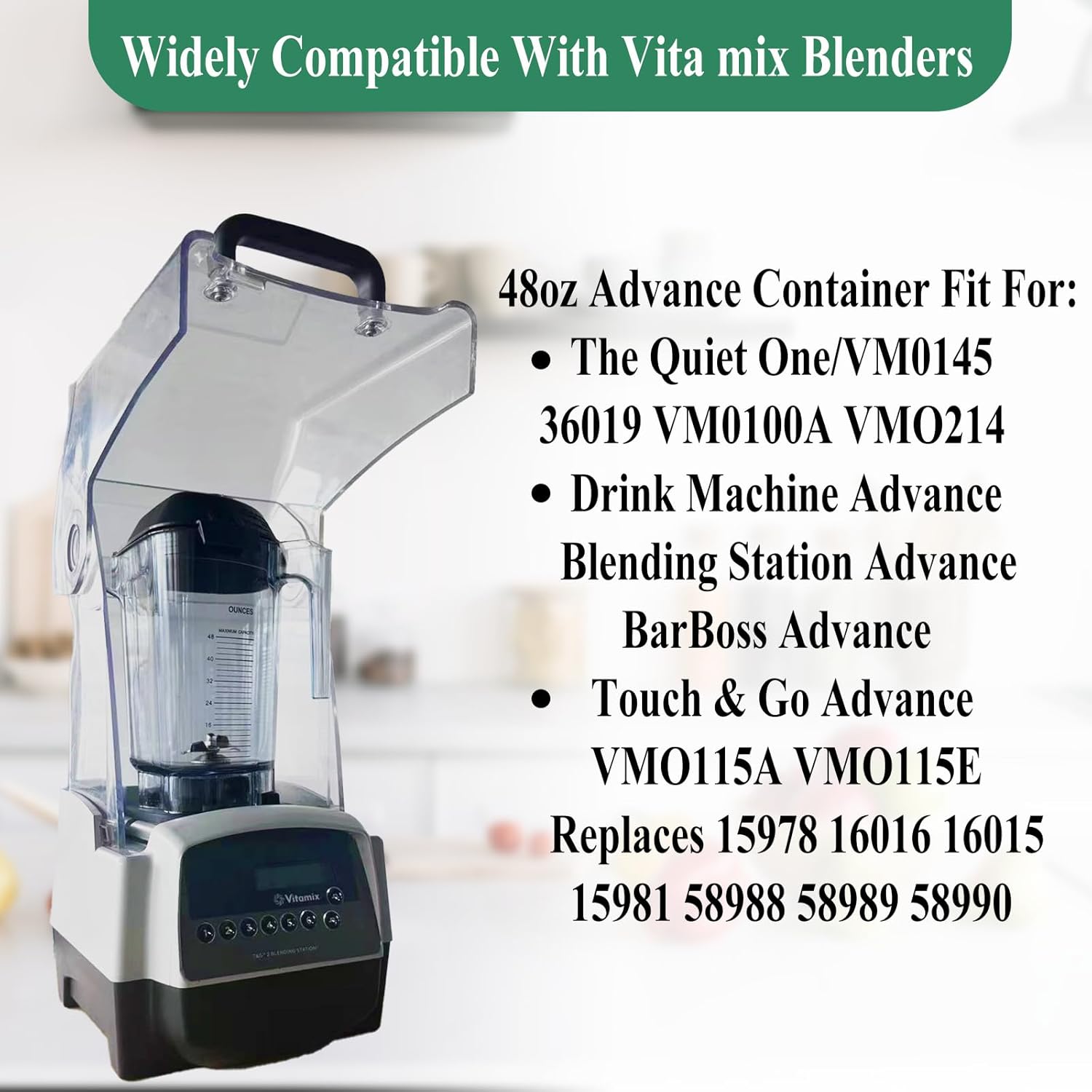 COMPATIBLE WITH BLENDER MODELS:15978 Advance 48 oz clear container is compatible with vitamix The Quiet One, VM0145, VM0100A, 36019, 15978, 16016, VM0214, Drink Machine Advance, BarBoss Advance, Touch & Go Advance, Blending Station Advance, 36019-ABAB, VM0115E, VM0115A, T&G 2 Blending Station blender pitcher. The blender pitcher can fully replace 32 and 48-oz advance containers 15978, 15981, 015978, 16016, 16015, 16019, 15982, 58988, 58990, 58991. If you are unable to confirm, please email us and we will be happy to help you confirm