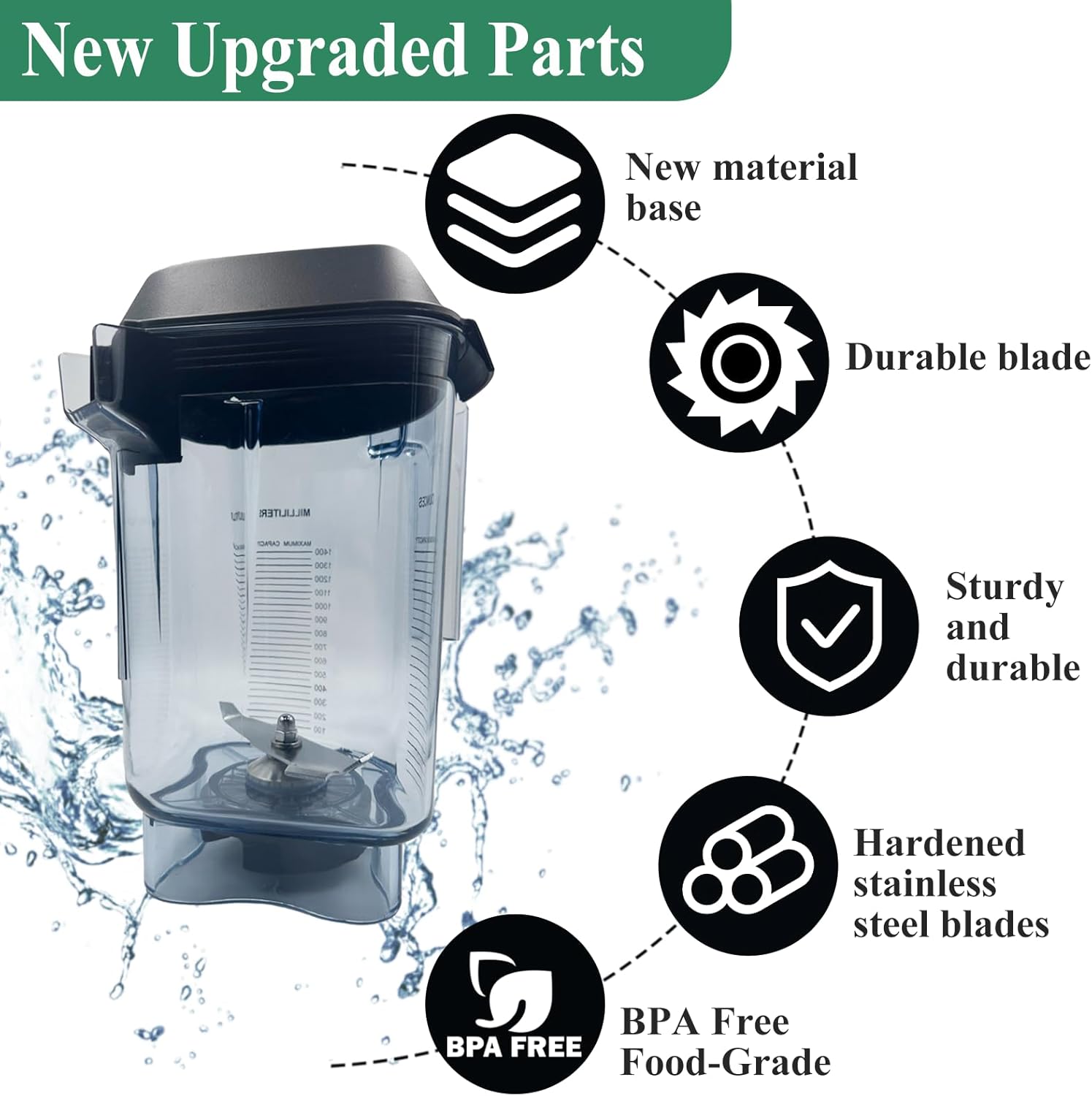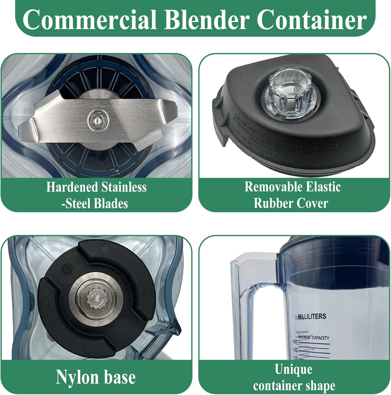 Excellent Design: A triangular shape with smooth sides make it much easier to scrape out all the ingredient with a spatula, with a great size easy to fit under cabinets. Our 48oz container jar pitcher, the cups are made of the safest food grade material, BPA free. The lids are newly upgraded, it can be opened for easy addition of food and use of tampering. The base is made of state-of-the-art nylon to prevent leakage and no noise. The blades are made of the best 304 stainless steel, laser cut, which can easily break food