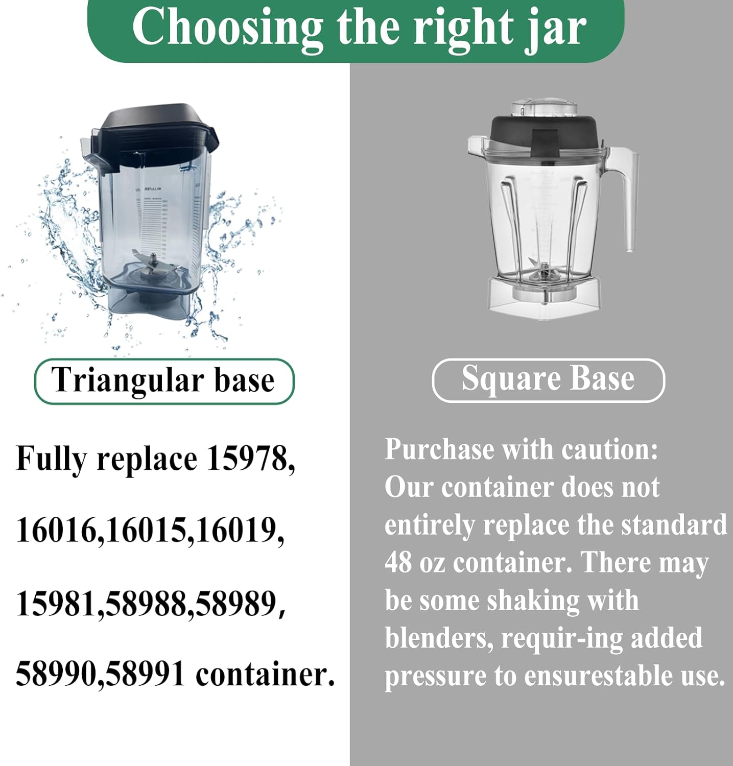 NOTE: The smoothie pitcher is not fully compatible with vitamix blenders with standard containers (square base). If you replace the standard container, there will be slight shaking, it is not recommended to buy this jar. This container accessories are 3-sided containers (triangular bases) that provide faster mixing and pouring, and smoothies are easier to pour and scrape, avoiding waste