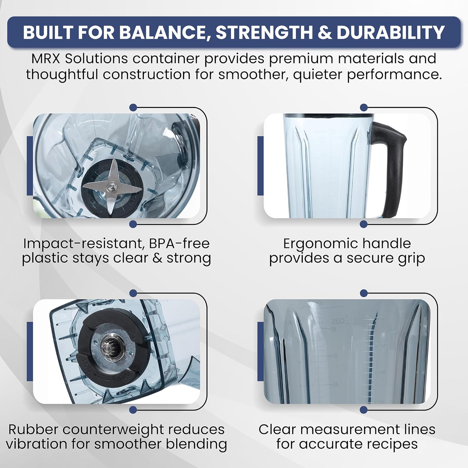 MRX SOLUTIONS COMPLETE 64 OZ BLENDER PITCHER + TAMPER: Includes a 64-ounce container, tamper, secure lid, and built-in stainless-steel blade. A ready-to-use replacement fully compatible with Vitamix Classic and Explorian blenders.