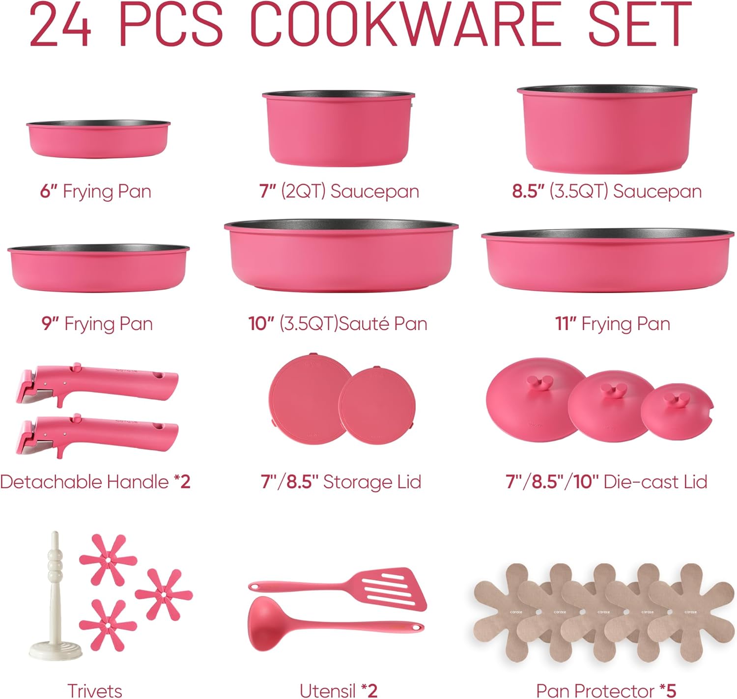 Set Includes: 6″ frying pan, 9″ frying pan, 11″ frying pan, 3.5-qt sauté pan, 2-qt saucepan, 3.5-qt saucepan, 2*detachable handle,7”/8.5”/10” Die-cast-lid, 7”/8.5” storage lid, 4*trivets, 2*utensil, 5*pot protectors.