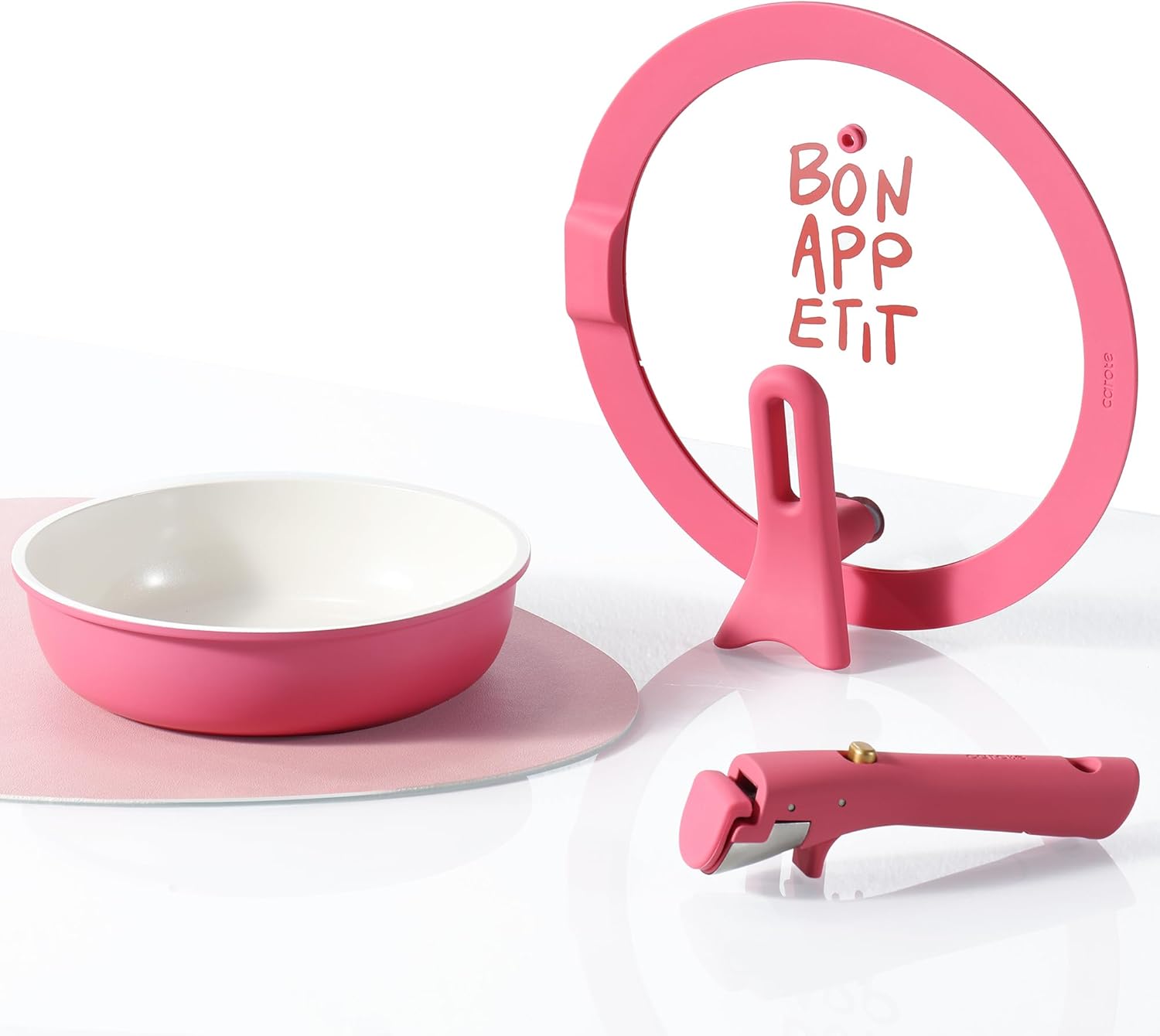 【Effortless Cleaning for Clutter-Free Cabinets】 Thanks to its non-stick properties, cleaning is a breeze. Serving as both cookware and tableware, Carote cookware set saves up to 70% space when handles are removed for optimal storage and easy stacking