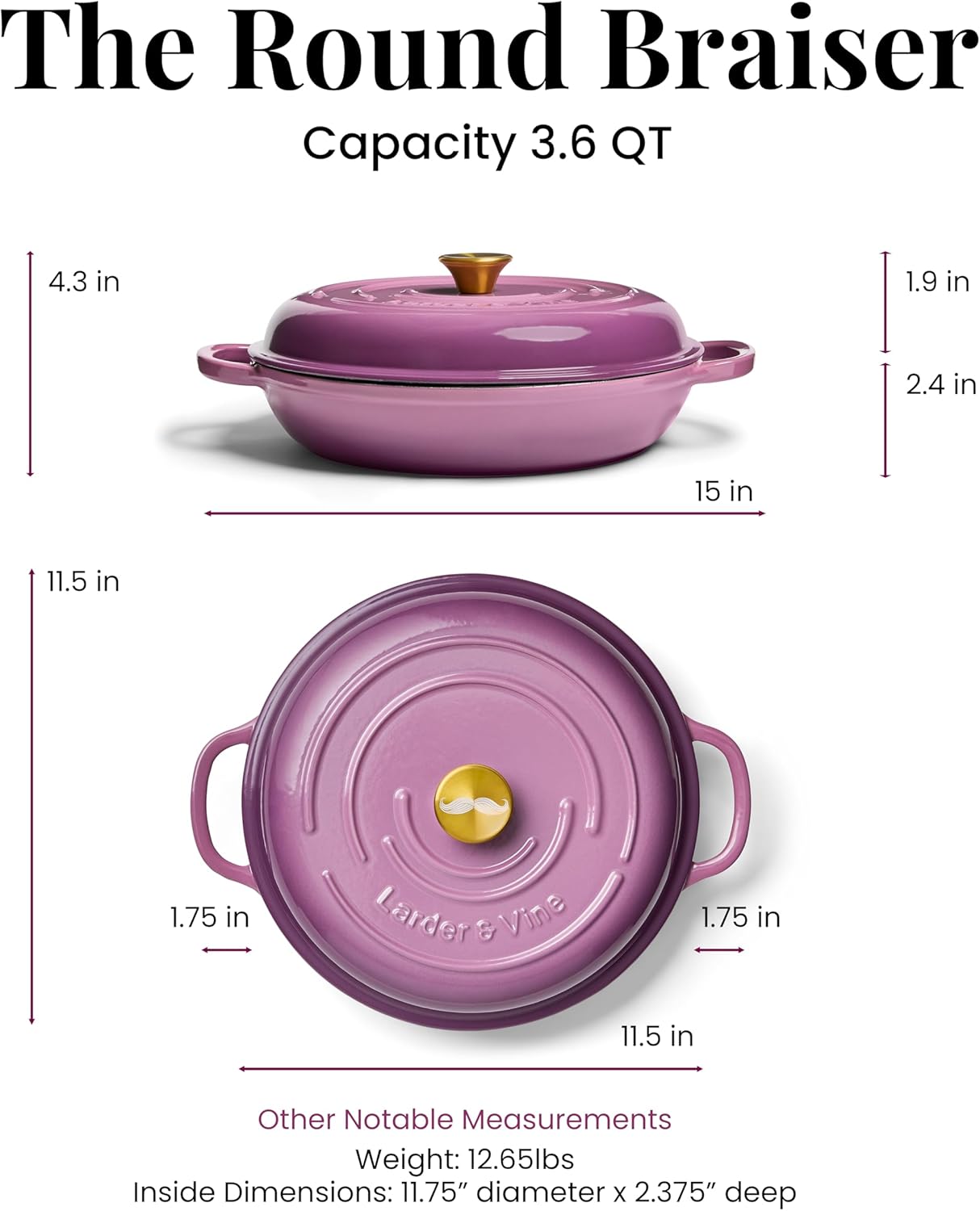 Break Rules (and Braise Like a Pro) with the Chef Joe Sasto Round Braiser — 3.6 Quart of Pure Culinary Power Designed in collaboration with Chef Joe Sasto, his enameled cast iron Braiser delivers style, substance, and serious performance. With its shallow profile, wide base, and tight-fitting enameled cast iron lid, it’s your go-to for braising, browning, baking, searing, and all-day simmering. From stovetop to oven to table, this 3.6qt workhorse does it all. Oversized handles offer a confident grip, while the triple-layer enamel locks in heat and resists staining and chipping for beauty that lasts. Why You’ll Love It (Besides the Grape & Gold, Obviously): Triple-Layer Enamel that can take the heat Non-Stick Interior: easy to clean, no seasoning drama required Smart Design: works on any cooktop, oven-safe, and can go straight to the table Moisture-Locking Lid = juicy results every time Clean Cooking: coating is free from PFAS, PFOA, PTFE and added lead and cadmium Even Heat Distribution for pro-level performance without the culinary school debt Non-Reactive Surface so your food tastes like food, not metal Chef-Approved: it’s got Joe’s seal of approval