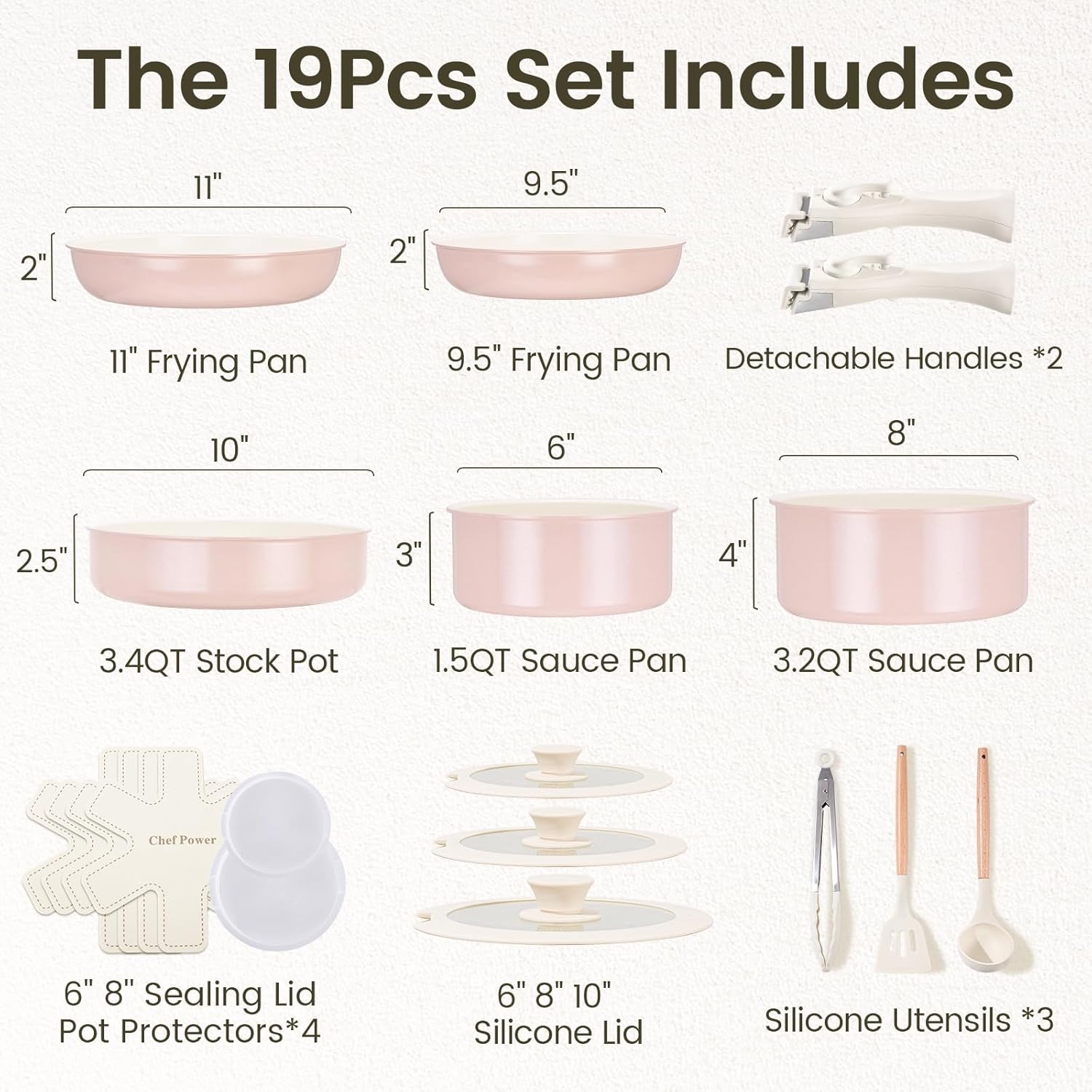 Complete 19-Piece Set – Includes everything you need: 1.5QT & 3.2QT saucepans, 3.4QT stockpot, 9” & 11” frying pans, 6”-8”-10” silicone lids, 2 detachable handles, 1 slotted turner, 1 ladle, 1 locking tong, and 4 pot protectors.