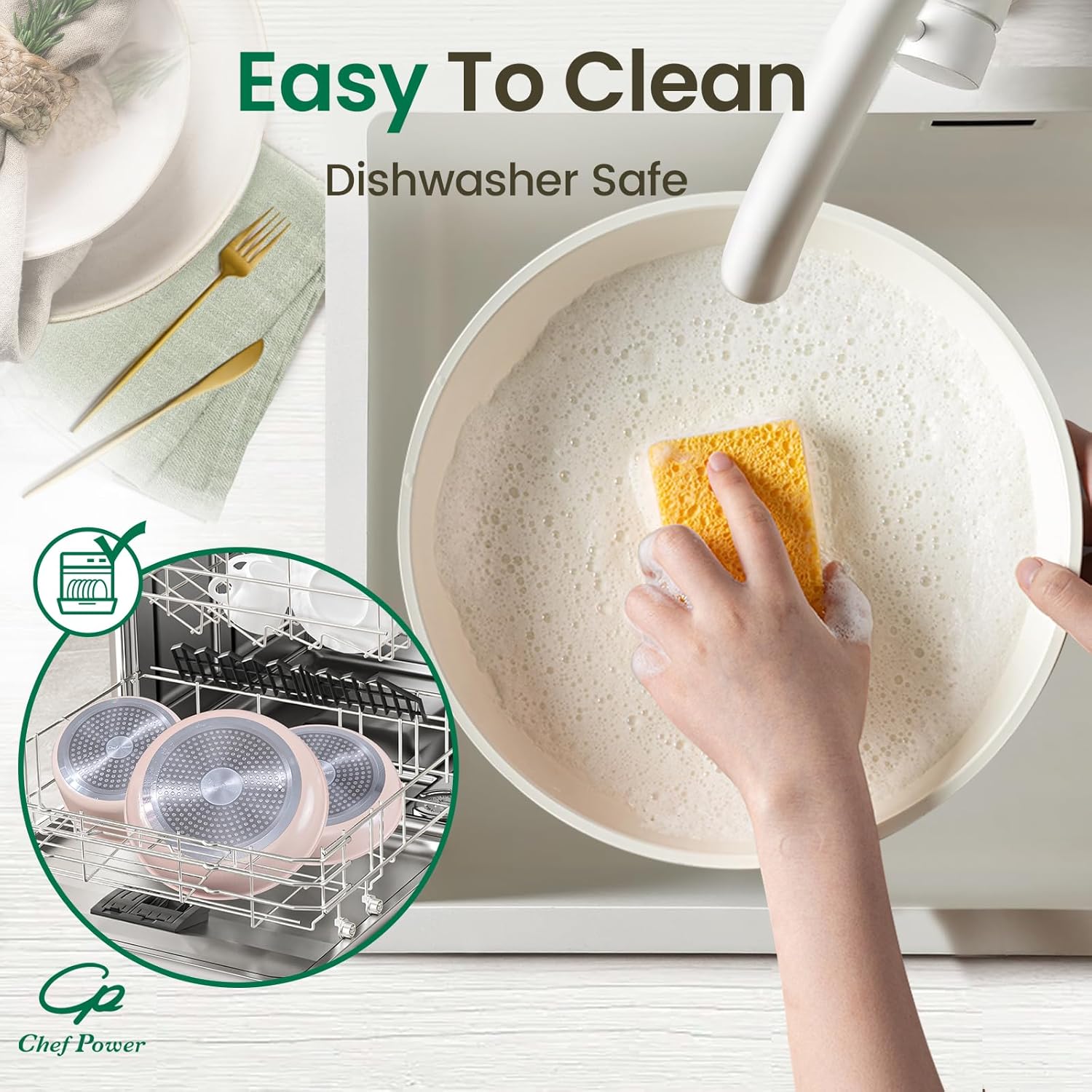 Effortless Cleaning – Crafted with a premium ceramic nonstick surface, our pans and pots ensure food slides off easily. Dishwasher safe and handwash-friendly for hassle-free cleanup.