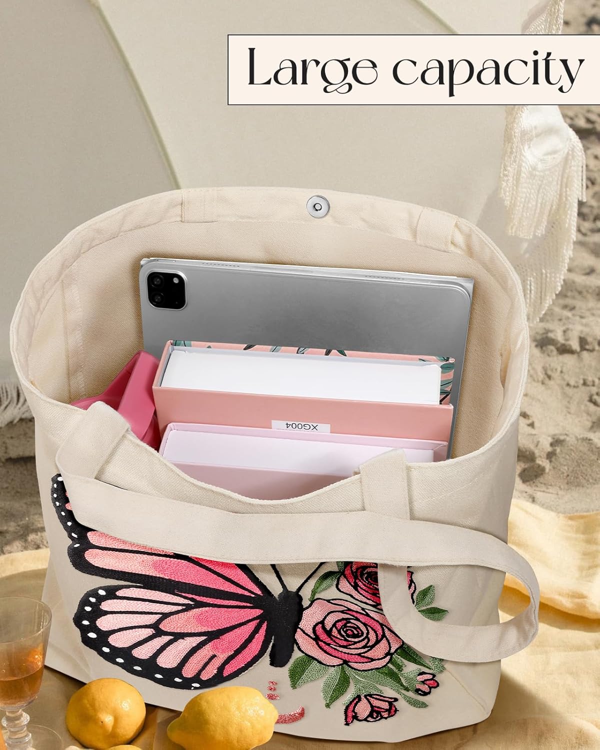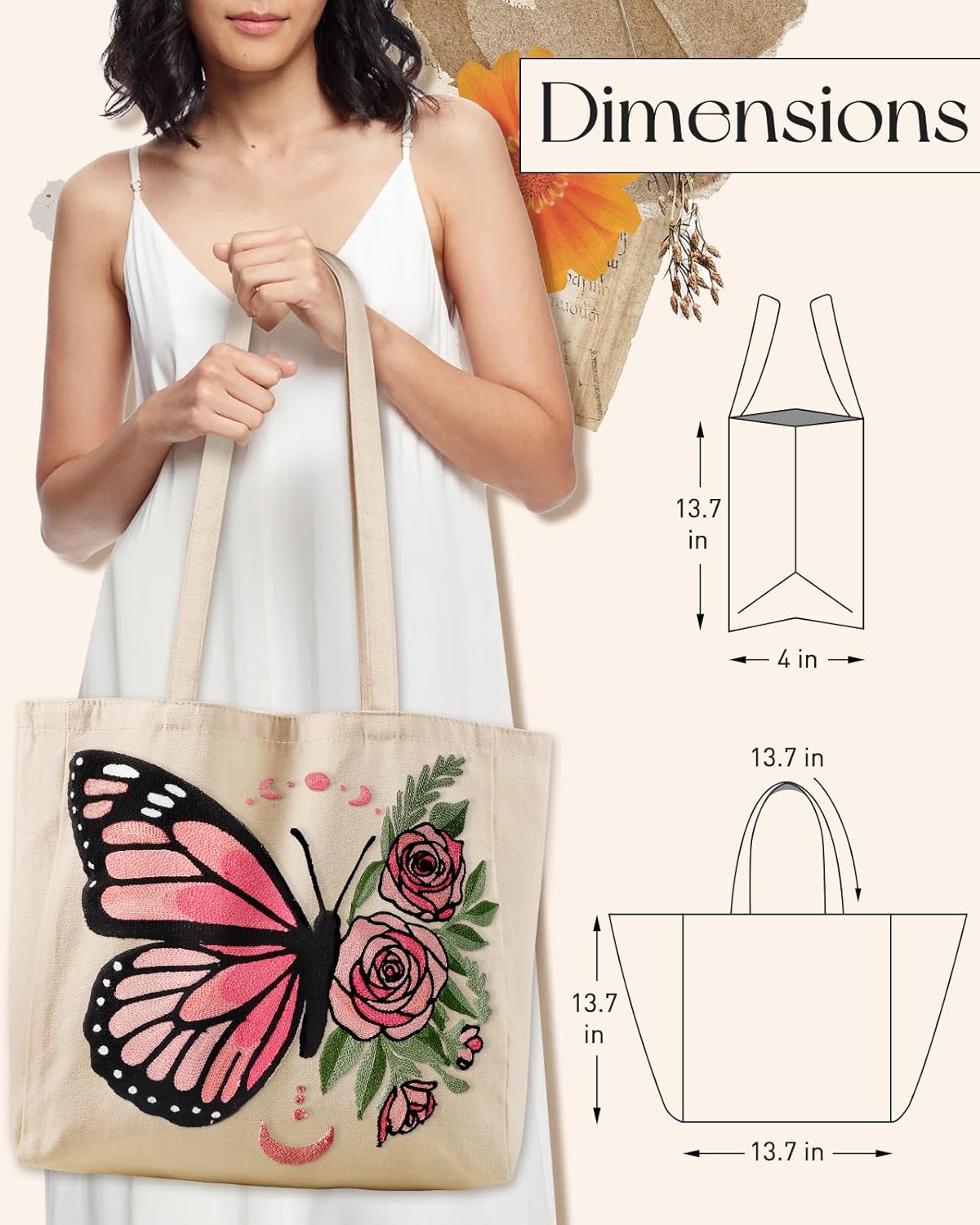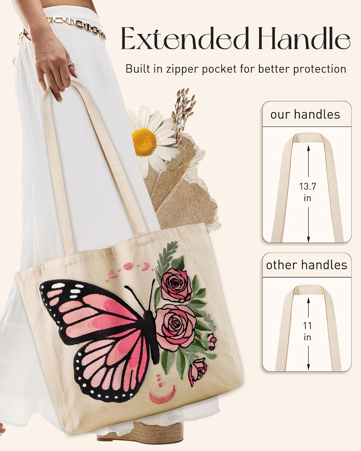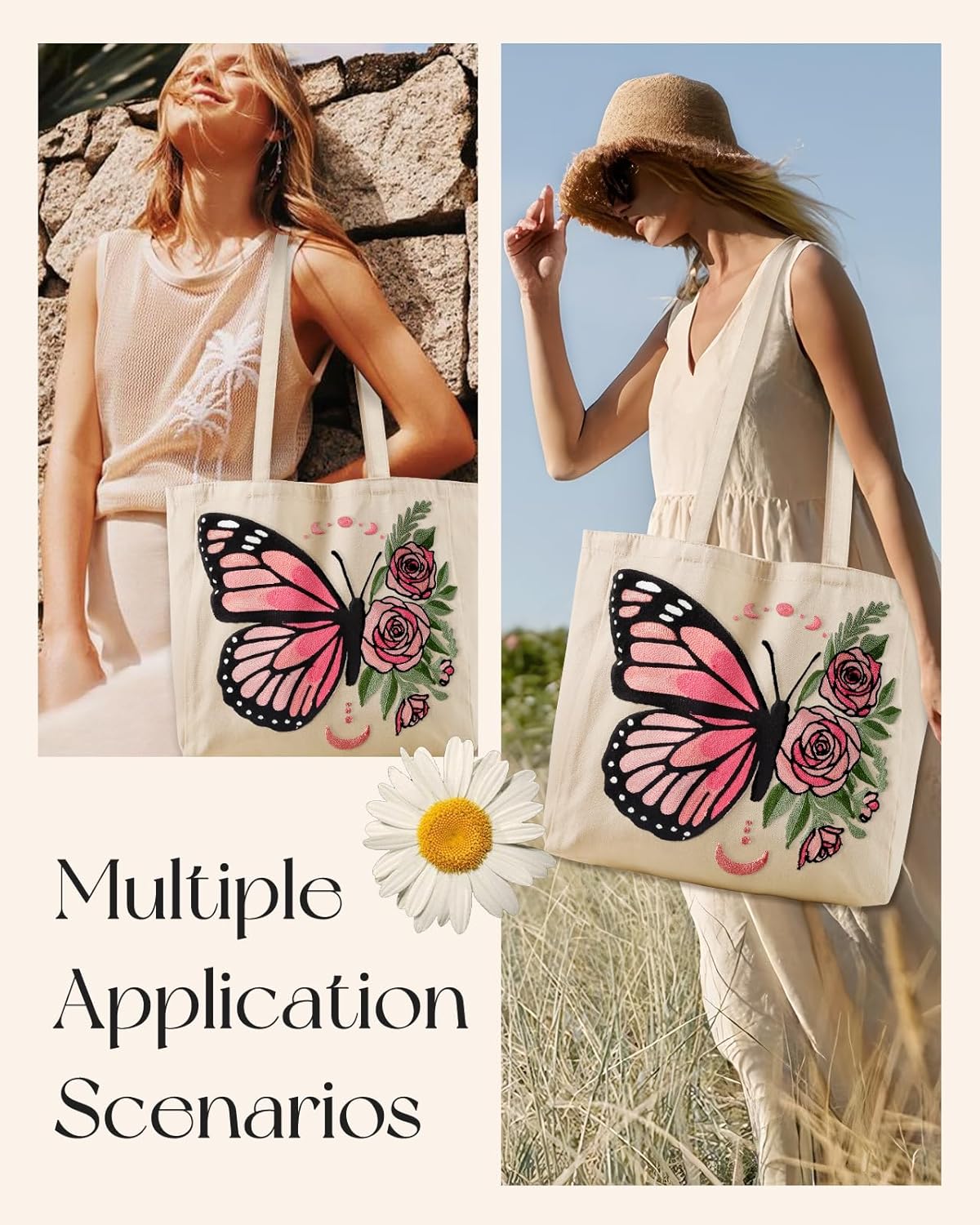 Embroidery Canvas Tote Bag for Women – Reusable Tote with Buckle Aesthetic Cute Shoulder Bag for Shopping, Grocery