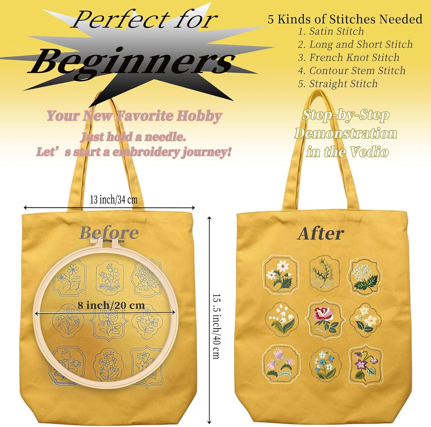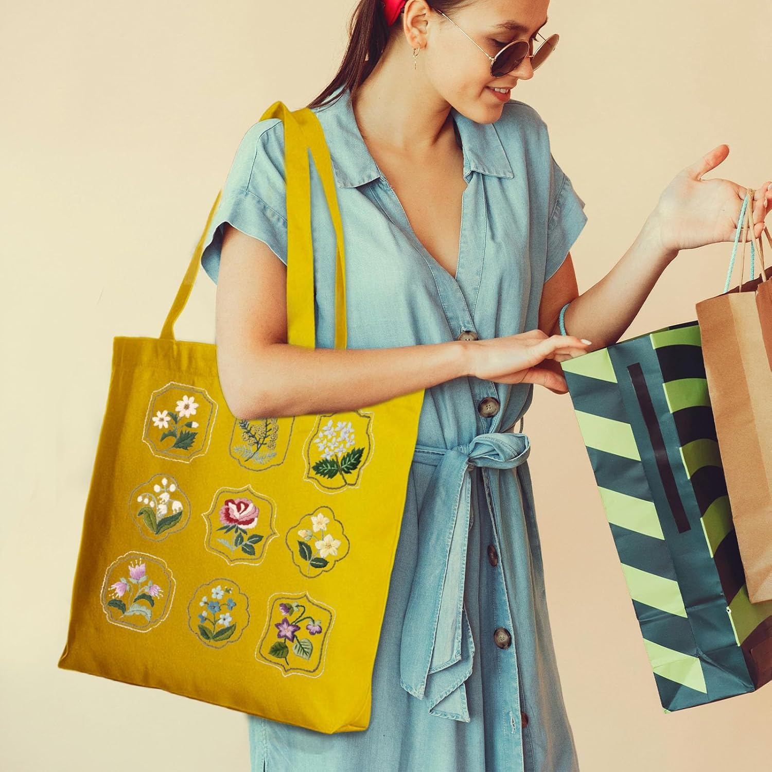 FONNUY Canvas Tote Bag Crewel Embroidery Kit, DIY Craft Kits Pre-Marked Pattern Bag Easy for Audlt Beginners, 15 x 13” (Yellow)