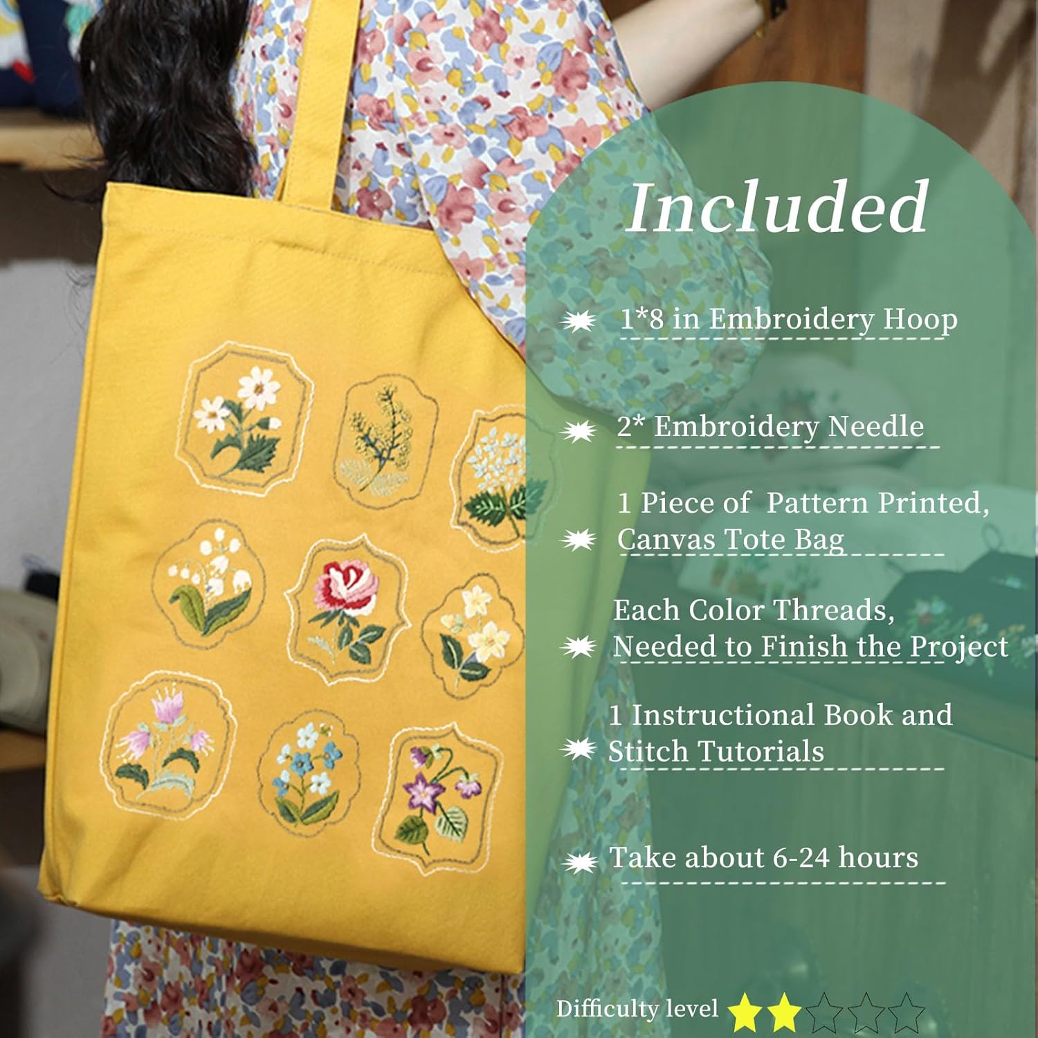 【Contains】Each kit contains 6-strand carded floss, needles, a pre-marked canvas tote bag, a 8” hoop and instructions.