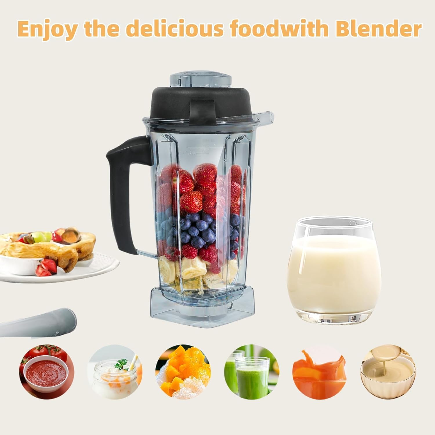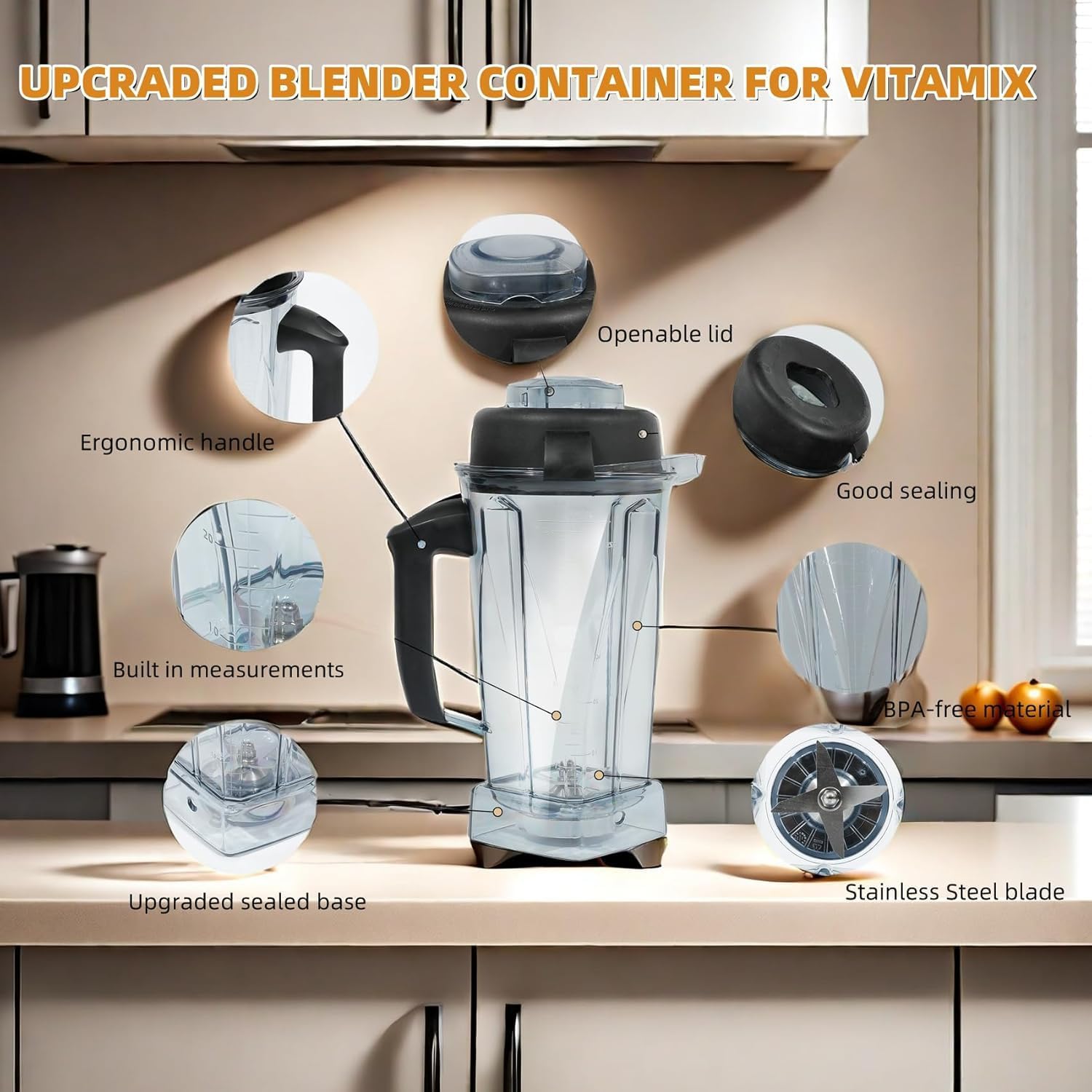 For Vitamix Blender Pitcher 64oz: The blender container for Vitamix has a large capacity with 64oz 8 cups, which can satisfy your family use. It features openable lid with excellent sealing, which can easily fill and pour your ingredient. The ergonomic handle enhance grip comfort, reduce fatigue, and improve control precision and safety.