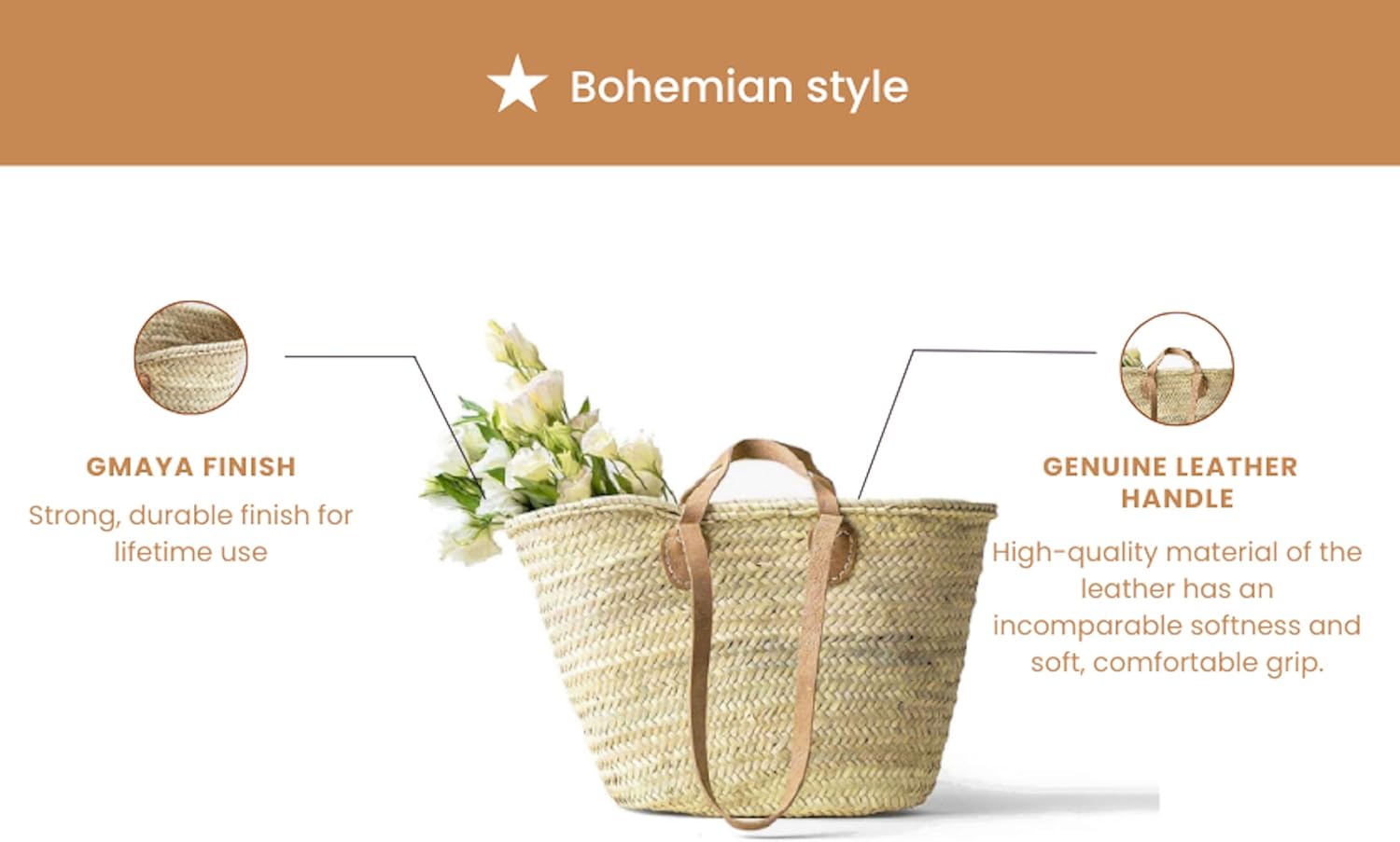 Sturdy and stylish, this shoulder bag was built to last. Even after a quick look at the elegant woven pattern and high-quality stitching, it’s easy to see why the Ibiza Basket is one of our bestsellers. French creation basket in 100% natural palm leaves. Large flat leather handles for carrying on the shoulder and small leather handles for carrying the hand. easy to wear over the shoulder, The short and long handles are super handy Perfect for the Farmers Market, running errands, the beach or a picnic. the bag is heavy and able to hold everything. french basket entirely handcrafted in our workshops. All the products of our brand BohemianStyle are designed directly in our workshops. We can guarantee you the best quality, and the best price on the market since we are the main actors of each step of our manufacturing. As a committed company, we pay special attention to the respect of the environment and work daily in this direction. Additional Features: This straw basket is a great beach or picnic basket and will also make a great storage basket at home. Each model is handmade and therefore unique. Details: the Ibiza basket with its double leather handles is a classic basket entirely woven by hand, made from palm leaves harvested at the local Doum factory. A beautifully crafted basket designed to accompany you everywhere. Package Includes: The product with a little gift for you and guides care for the french basket.