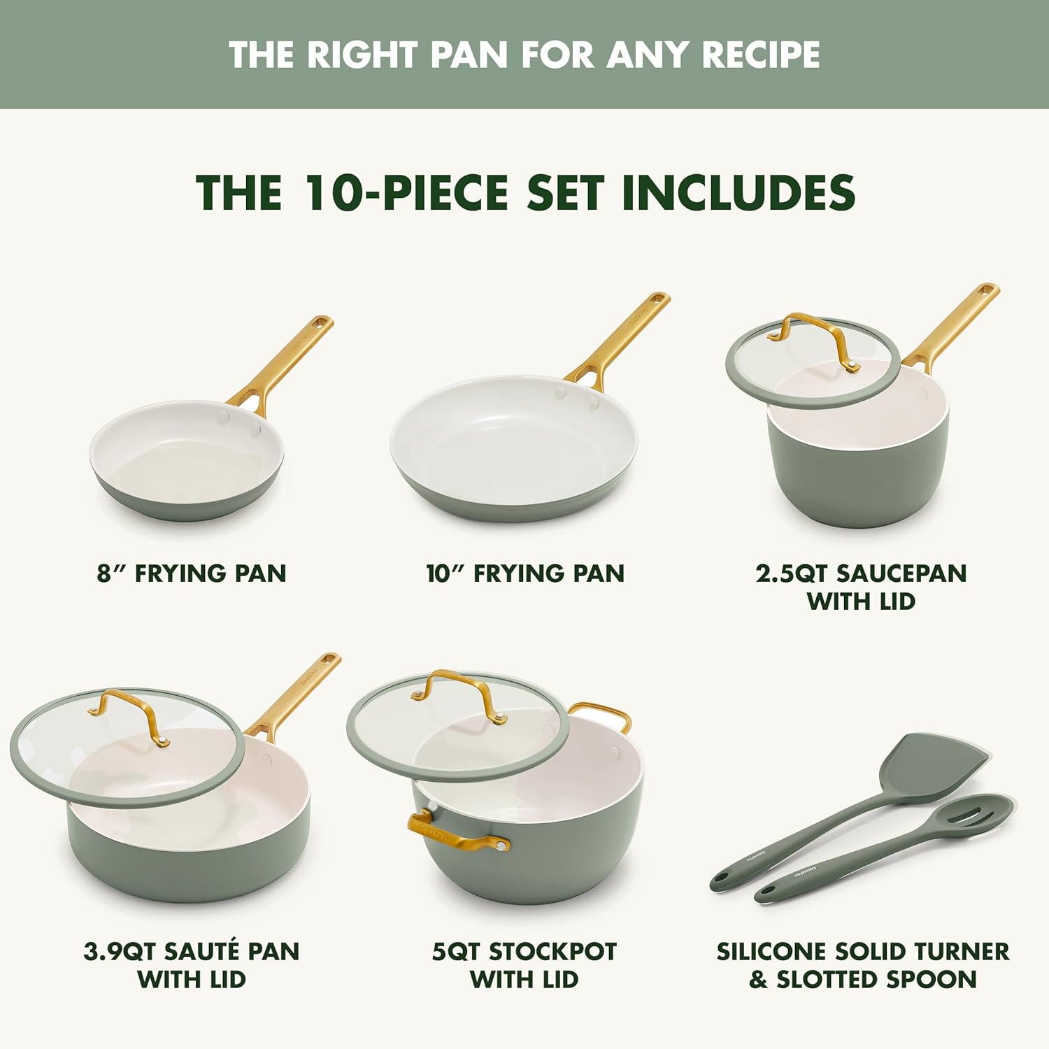 10-PIECE COOKWARE SET INCLUDES: 2.5QT Saucepan with Lid, 5QT Stockpot with Lid, 8” Frying Pan, 10” Frying Pan, 3.9QT Sauté Pan with Lid, Silicone Solid Turner, Silicone Slotted Spoon