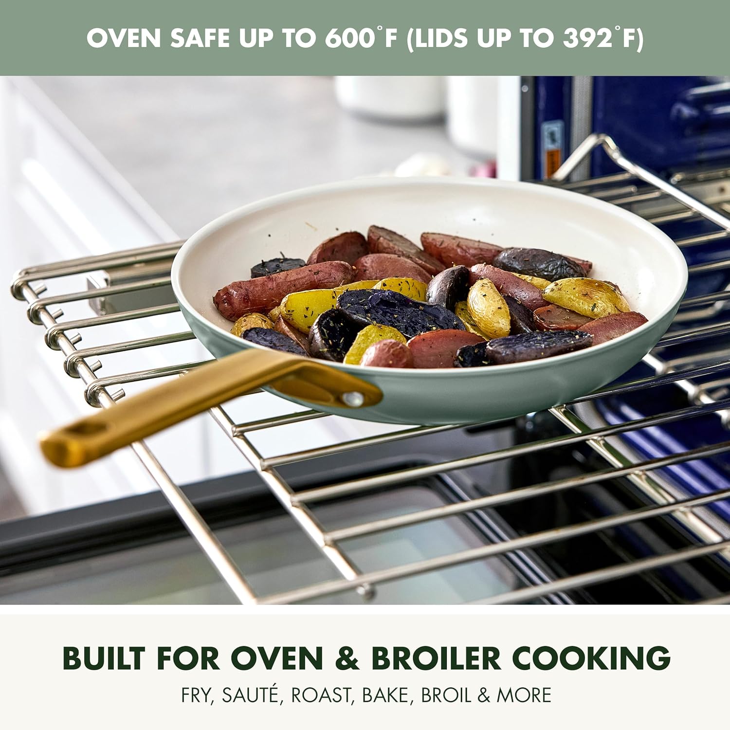 STAINLESS STEEL GOLD-TONE HANDLES: Riveted matte-finished handles offer a safe and secure grip while adding a pop of design to any kitchen.
