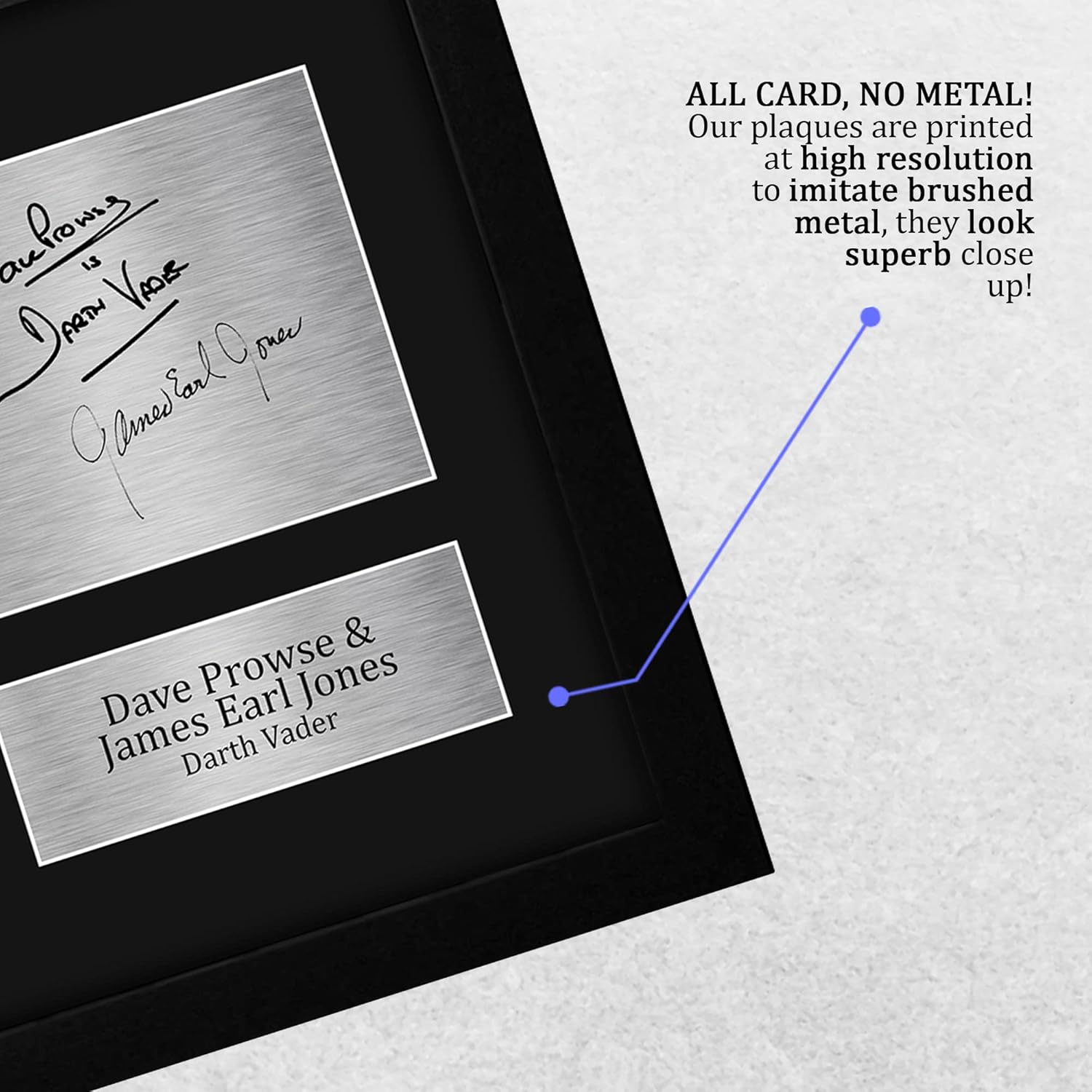 Professionally made in our studio, this US Letter Size (8.5×11 Inch) framed display makes for an ideal gift idea. This laser printed quality photograph is mounted in a precision cut three windowed acid-free matt black display board. To the left of the display there is the main image. To the right of the display there are two metallic effect plaque areas for printed copies of the name and autograph signature. This print comes framed in a sleek black polycarbonate frame that compliments the matt mount display. Lightweight, but of the highest quality, these make the ideal Christmas/Birthday gift for fans of all ages, and best of all, they definitely won’t break the bank!