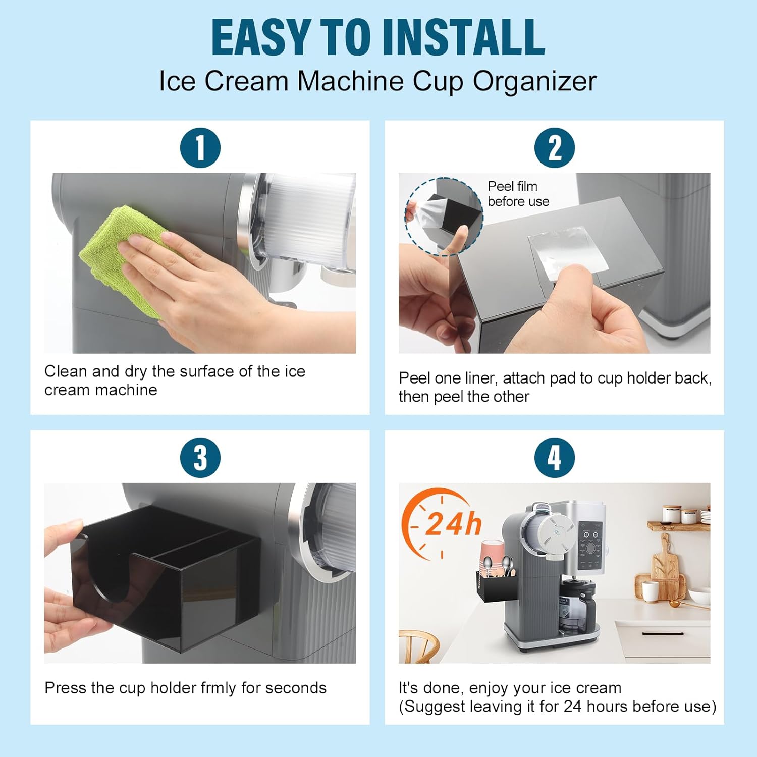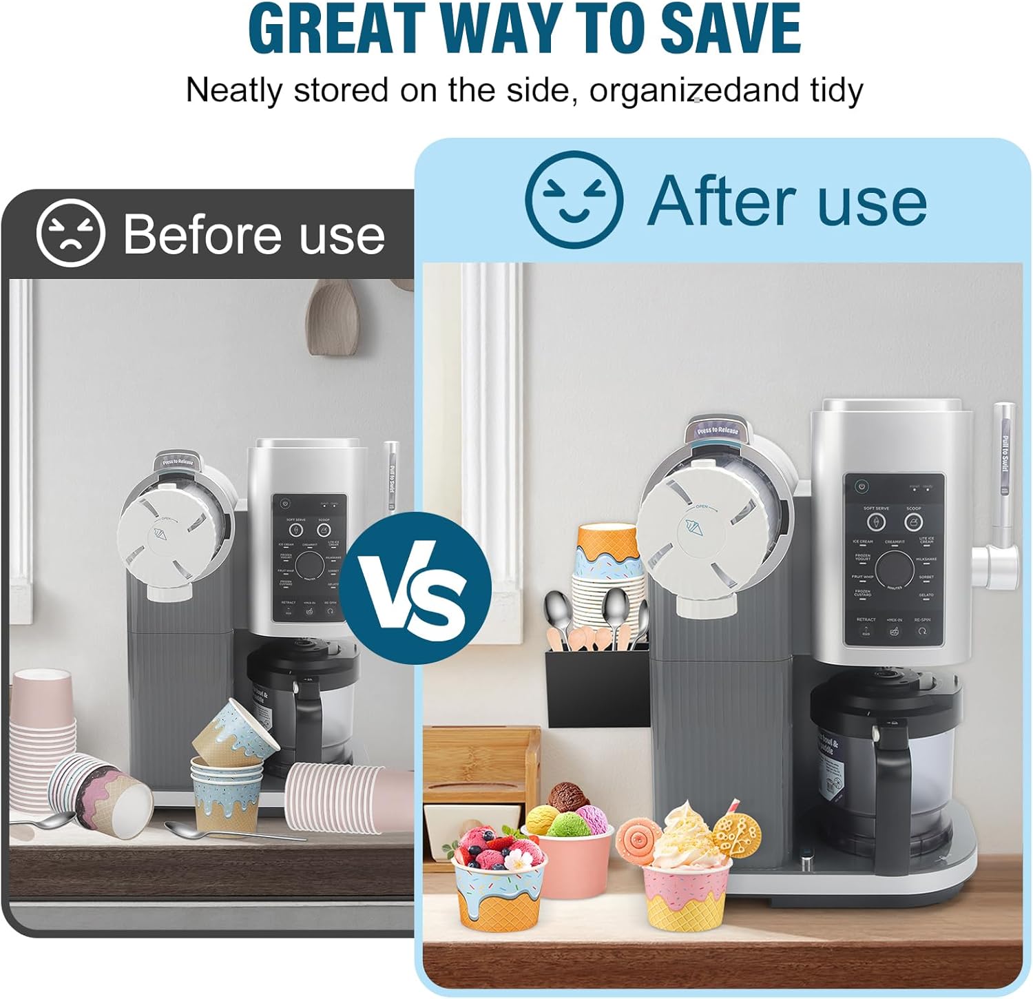 Effortless Adhesive Organizer: 5.08″x3.8″x2.75″ compact design. Tool-free installation – simply stick the ice cream bowls holder to machine sides. Withstands high-speed blending/vibration without shifting. Stays secure for long-term use.