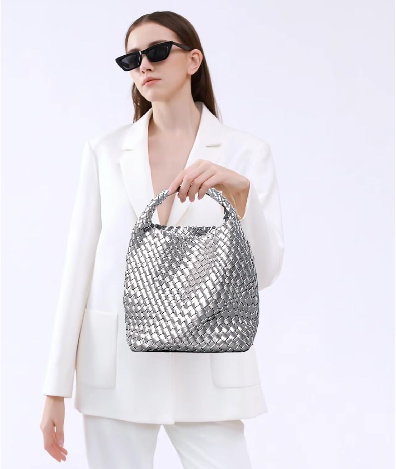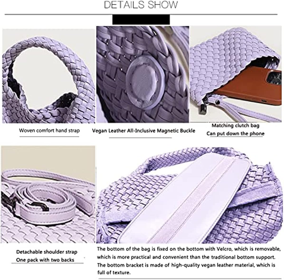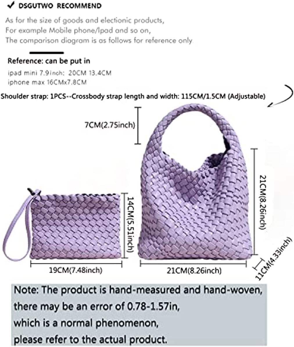JINMANXUE Women Woven Handbag Material: Handmade Woven vegan leather Dimensions1.Tote Bag Size : 8.26″(21 cm) x 8.26″(21 cm) x 4.33″(11 cm)(W x H x D) 2.Wallet Clutch: 7.48″(19 cm) x 5.51″(14 cm)(W x H). Handle Drop: 2.75″(7 cm). Shoulder Strap: ((45.27″(115 cm) in length) for more carrying options: Single Shoulder/ Crossbody. Style: casual & hobo & bucket bag & shoulder bag & crossbody bag Occasion: travel & shopping & daily life & work.This handbag is so roomy, there is a main compartment to hold your wallet, phone,Ipad and ect. Compared to a large bag, it may be a bit mini, but you can easily hold small items such as mobile phones, lipsticks, keys, tissues and so on when you go out. Multi-mode Use Effect Simple Design, Hobo Style, You Deserve It!