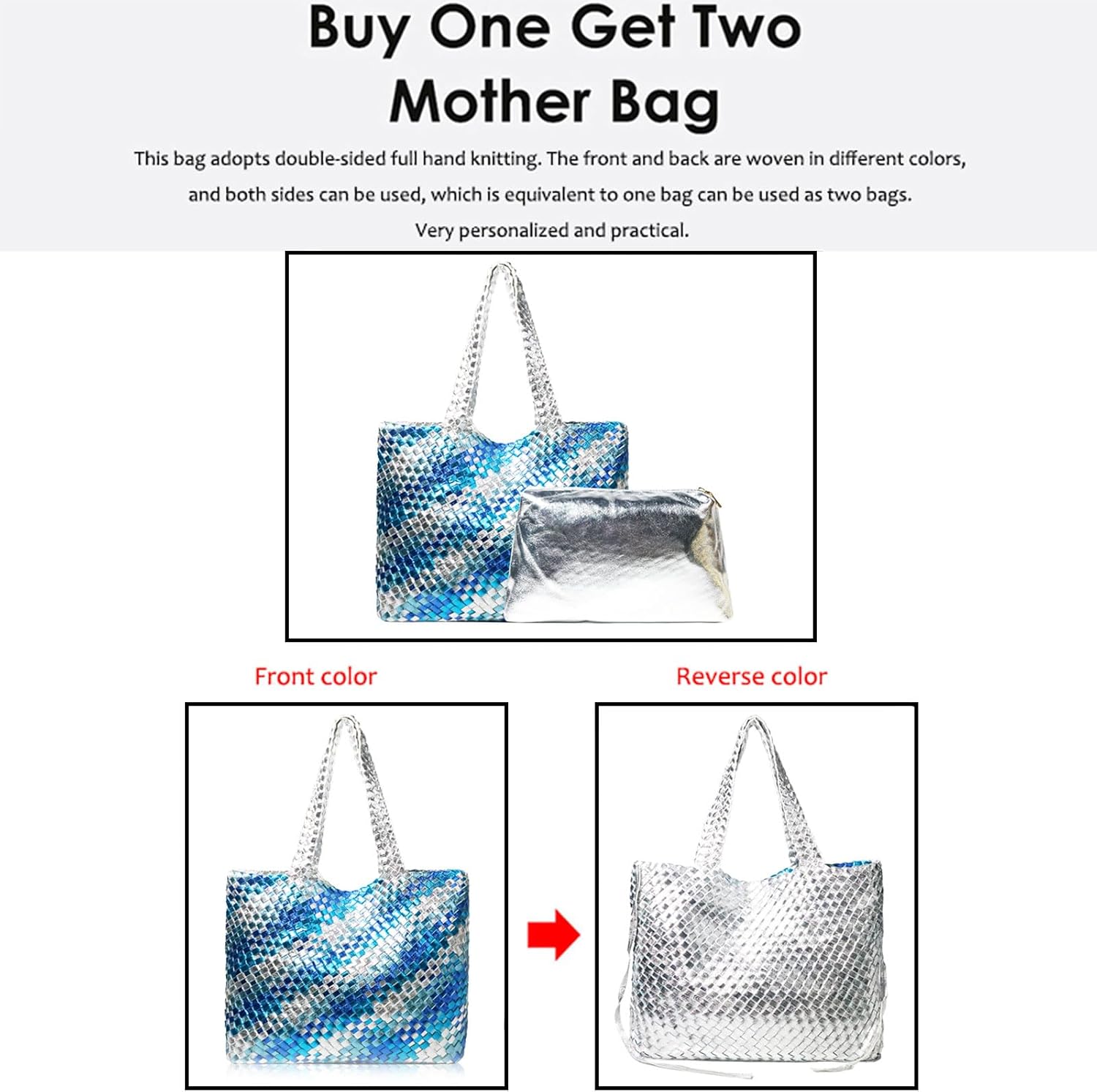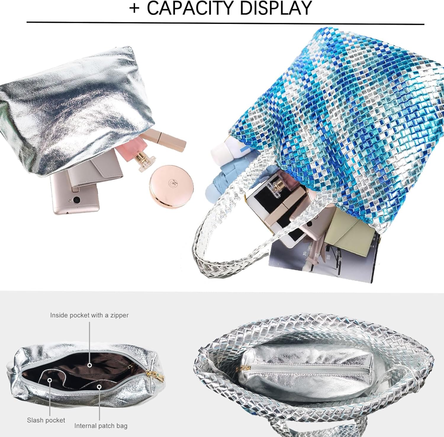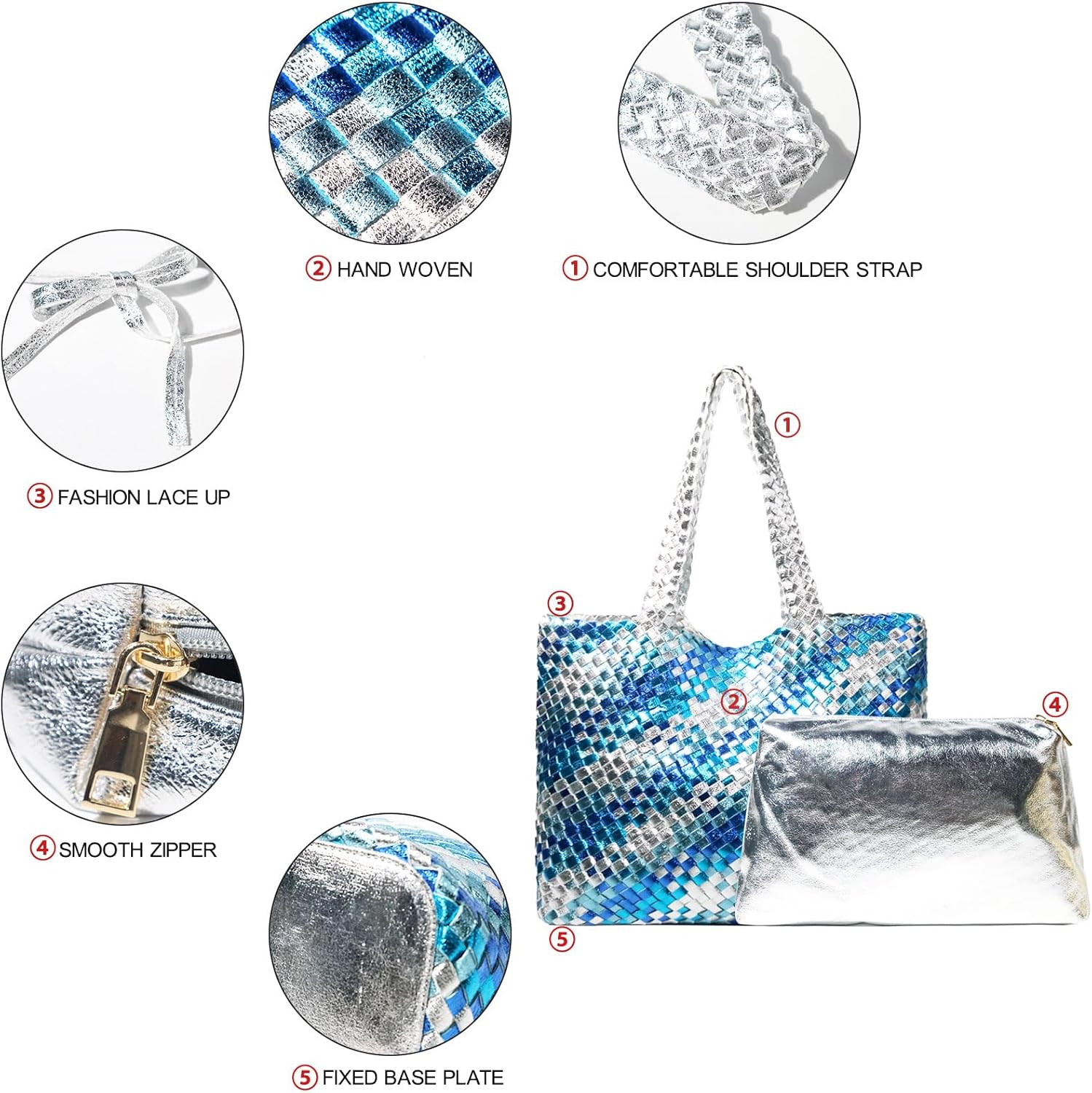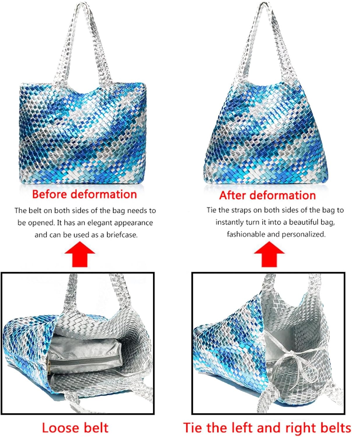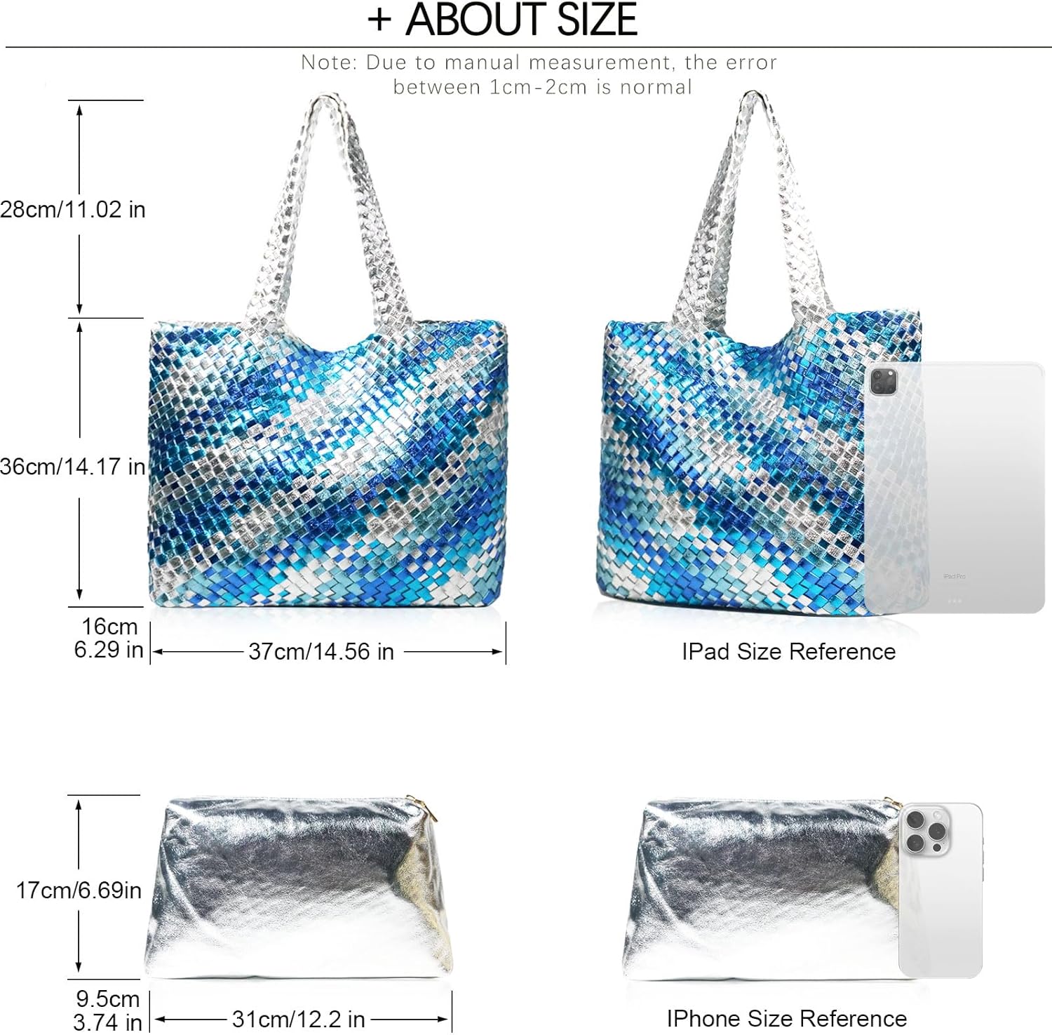 Hand woven bags can be used as a tote, shoulder bag, handbag, hobo. Great summer bag, it is spacious and versatile with a cute clutch so you can take it to the beach or go travelling. Go with any style such as dresses, skirts, jeans, trousers, coats, jacket as well as high heel shoes, sandals, pumps, sneakers and slippers. Size Reference Main Pockets: 14.5″ W x 6.2″ D x 13.7″ H; Handle height: 9.8″ , the handle easy to hold, but long enough to go on your shoulder; Clutch: 12.2″ W x 3.5″ D x 8.2″ H, where you can place your makeup or valuables (i.e., wallet, keys and cell); large capacity bags for women This top handle handbag inside is the perfect size to hold essentials minus a tablet or mini laptop. It also fits things like a makeup bag, phone, wallet, book, etc. Tie The Rope Compared with casual zip or magnetic closure, this shopper bag fits double rope to keep your items safe. Plus, when you tighten the rope inside, you get a beautiful woven hobo. Woven Hobo Unlike the usual square tote bag on the market, the large tote bag can change its shape as a ladies hobo. This 2 in 1 design makes this handbag more flexible. woven tote bag for women The roomy space woven tote bag have a wide open mouth to ensure its quick access. Providing wide range of view so that you don’t waste time to find everything you want. Retro leather handbag made of durable vegan leather with delicate handmade instead of machine. Foldable design Soft Foldable Foldable design so you can store it in the corner when not in use without losing its shape. durable handbag Durable Handbag Smooth handle handbag is working to send you comfortable when you go out shopping or travelling. good stitched Neat Stitching Neat and tidy stitching by careful craftsmanship consist in creating durable and strong bag. 3D Bottom Sturdy Bottom Rectangular base on the inside to keep the case stable on a desk or in a car.