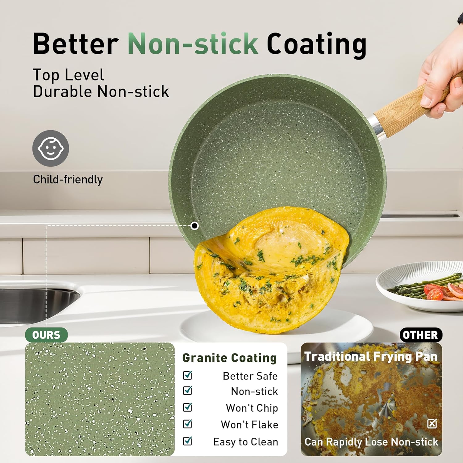 Non Toxic Cookware Set – Granite nonstick surface, free of PFOA, PTFE, PFAS, PFOS, lead, cadmium and other toxic substances that can leach into food