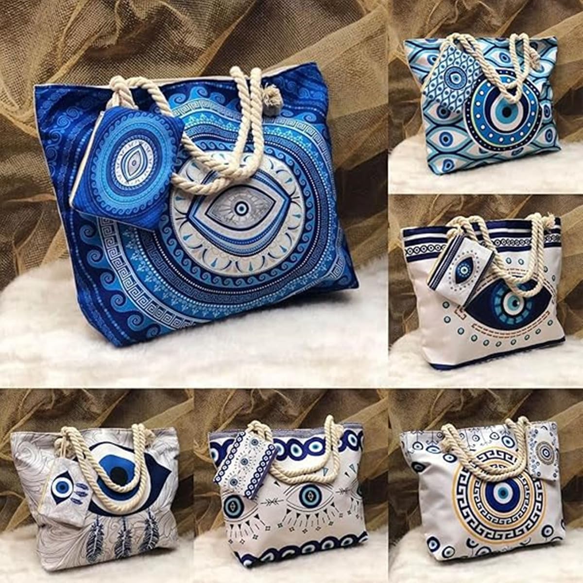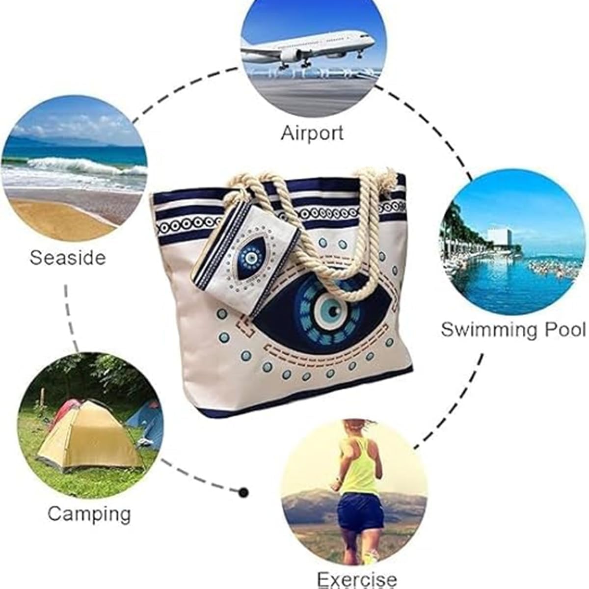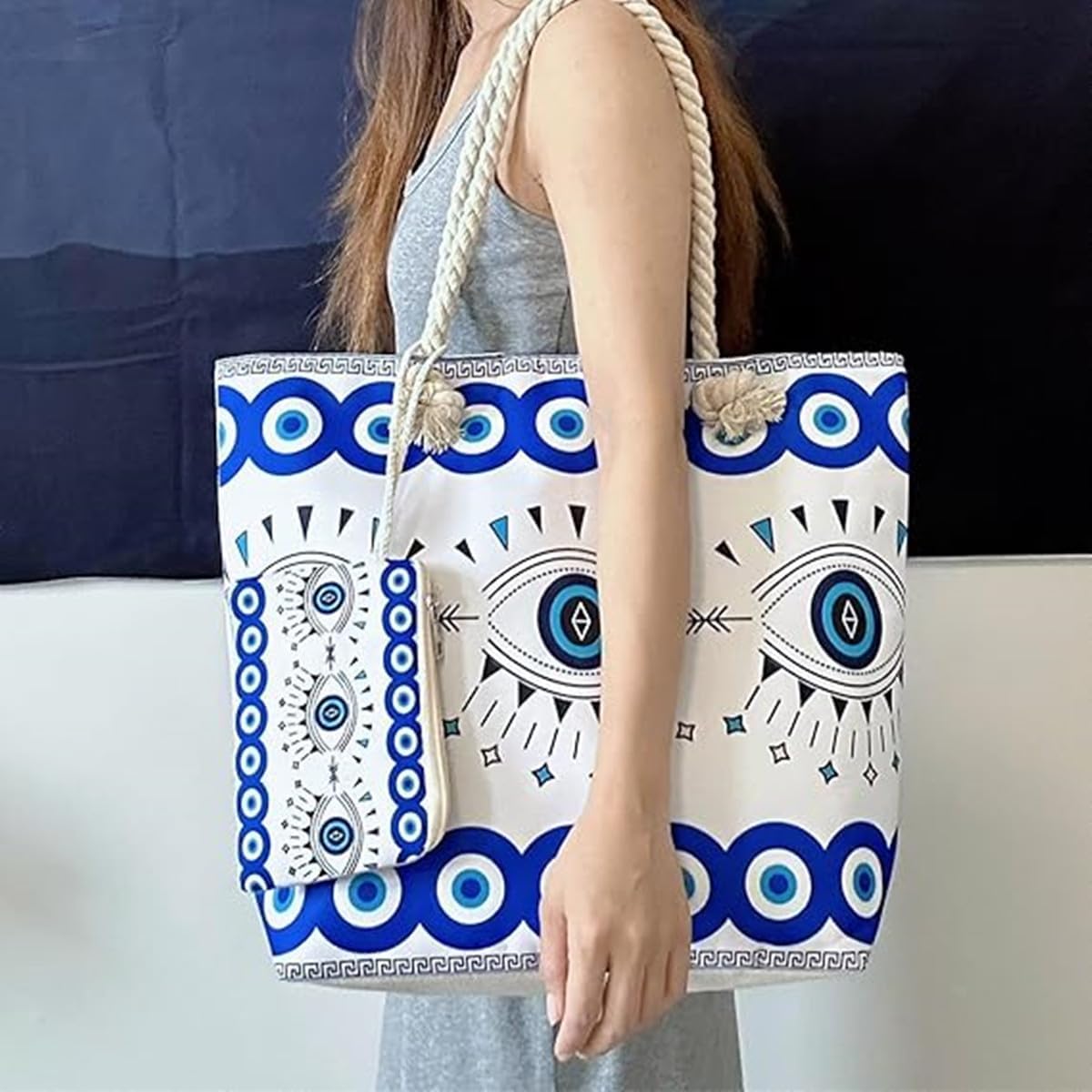 Large Capacity Women’s Evil Eye Beach Tote Bag, with Wet Compartment and Zippered Pouch for Travel, Pool, and Everyday Use