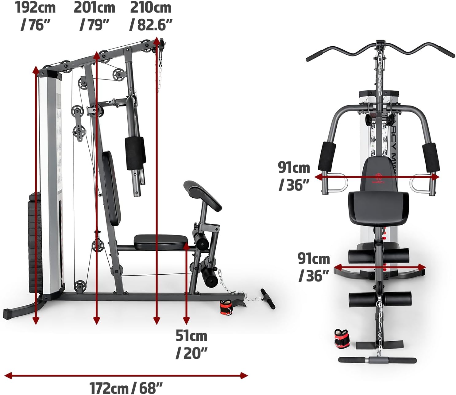This home gym system is made out of a heavy-duty 14 gauge steel tube frame. Protective stack covers can be found on the weights for added durability. The tough frame can fully support 150-pound weights that are in constant motion. The entire home gym comes unassembled but it is easy to put together as all the required hardware is included along with instructions.