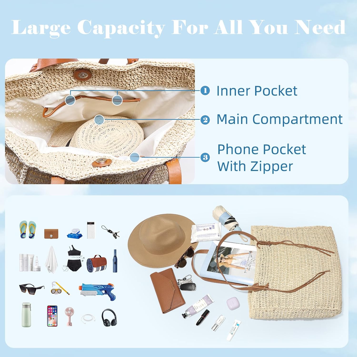 miss fong Summer Beach Bag, Beach Bags for Women,Straw Bag Straw Beach Bag Handmade Woven Tote Bag for Holiday Beach Trips