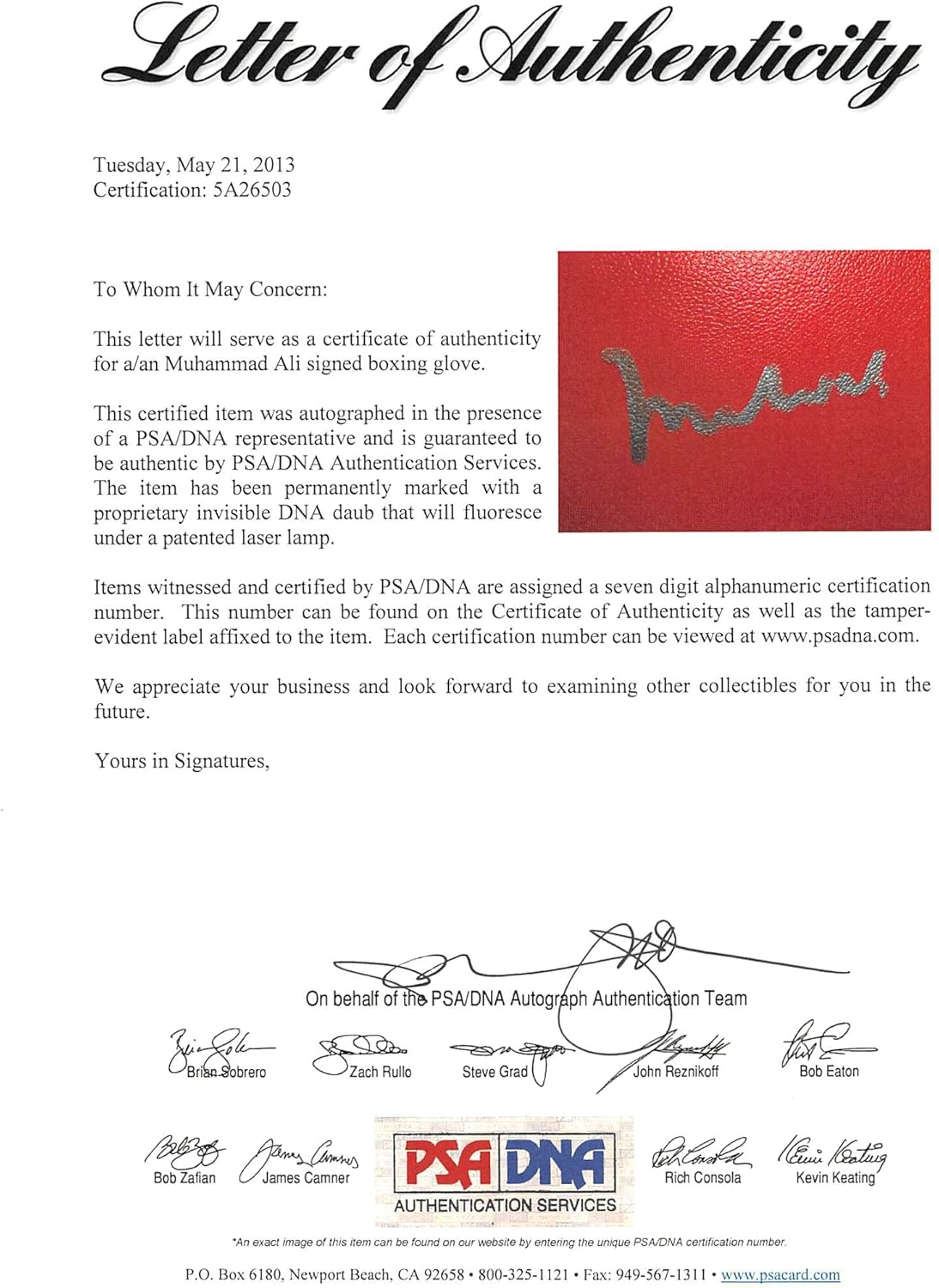 This Autographed Red Everlast Boxing Glove has been Personally Signed by Muhammad Ali. This item is 100% Authentic and comes with a PSA/DNA Certification Card and a matching numbered Hologram. This is a PSA in the Presence Authenticated item which means a PSA representative was present when this item was being signed. The authenticity can be verified on Professional Sports Authenticator website.