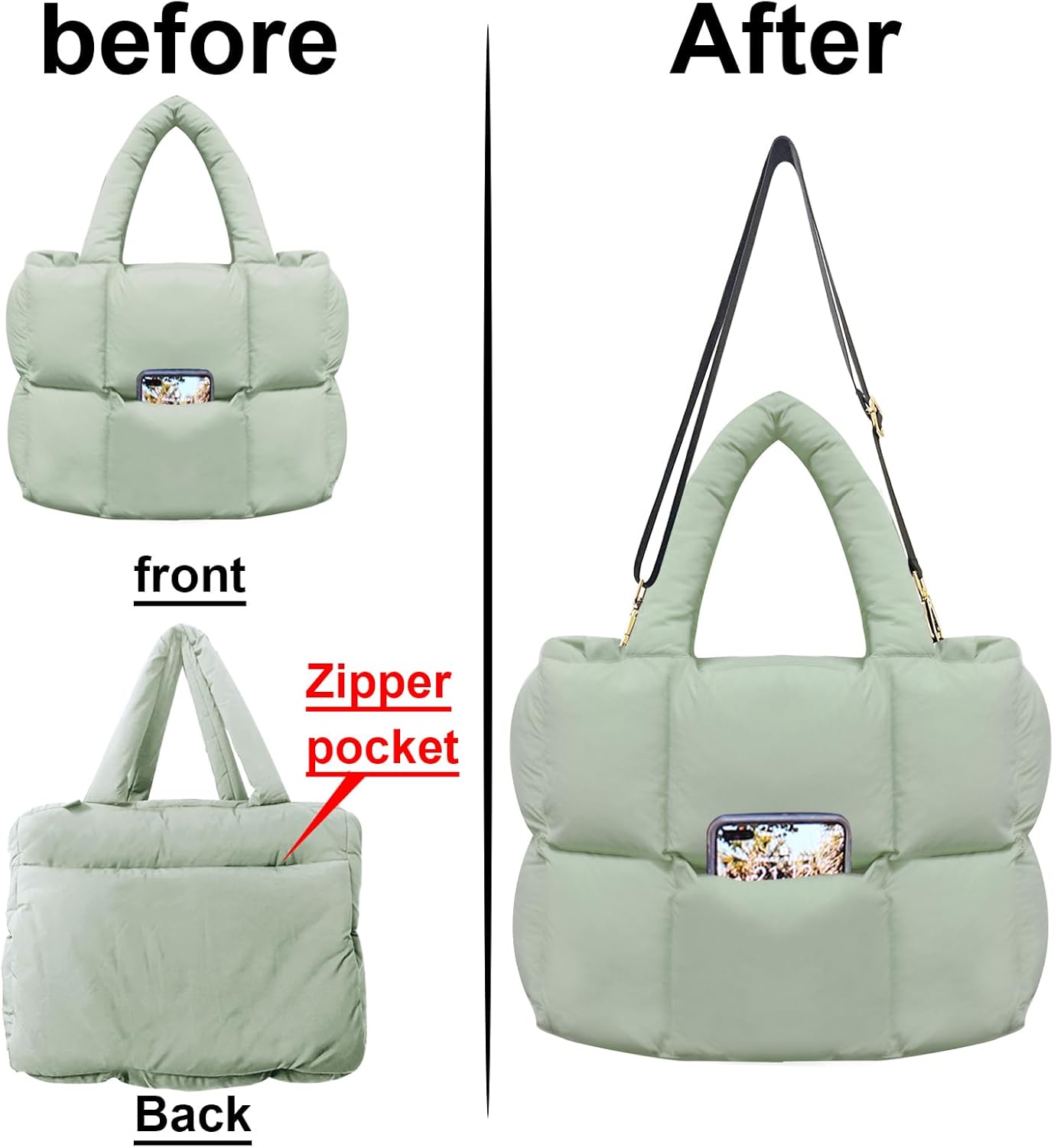 Puffer tote Bag Multiple Backing MethodsHandmade quilted front bag with change pocketLarge zippered pocket on the back