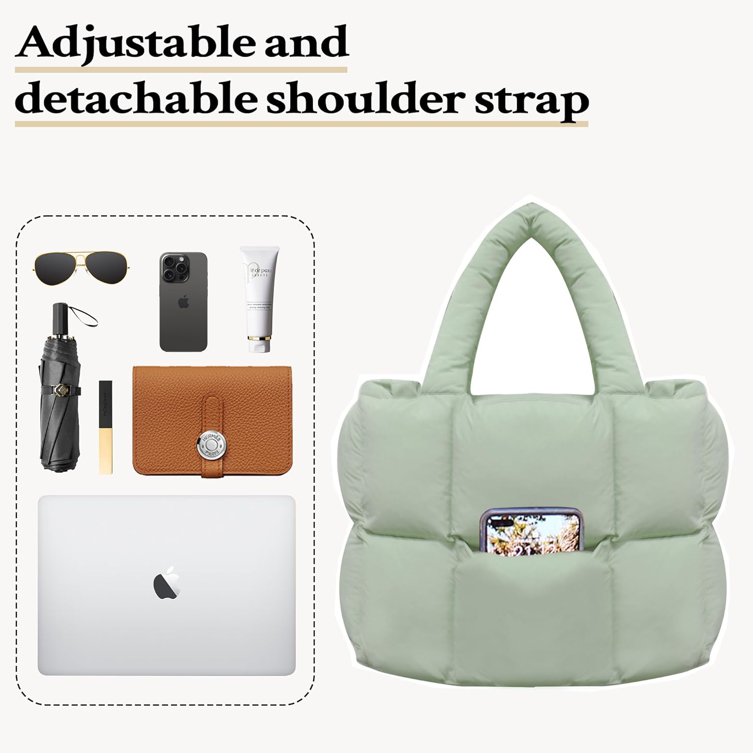 Lightweight Shoulder bag for Women, Fits anywhere Soft Quilted Padding Tote Bag Purse, Big Capacity, lightweight and durableDetachable crossbody one shoulder tote bag