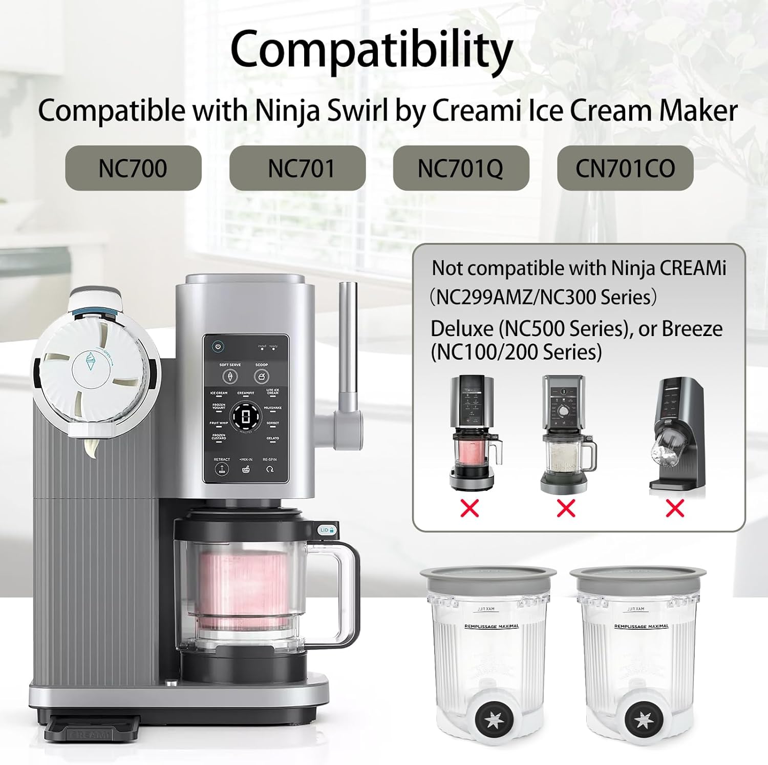 COMPATIBILITY: Ninja swirl pints and lids replacement are ONLY compatible with Ninja Swirl by Creami Ice Cream and Soft Serve Makers, including NC700, NC701,NC701Q and CN701CO. NOT EXCEPTION!EXCLUDE Ninja Creami (NC299AMZ/NC300 Series), Deluxe (NC500 Series), or Breeze (NC100/200 Series) Ice Cream Makers.