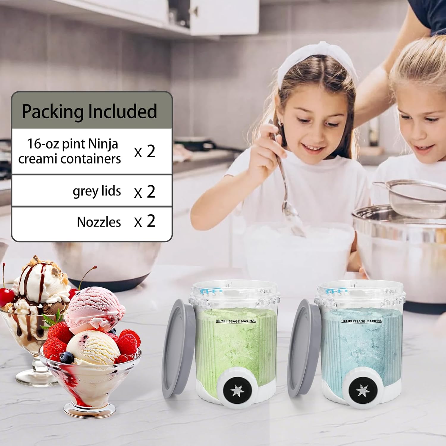 PACKAGE: (2) 16-oz pint Ninja creami containers + (2) grey lids of Ninja swirl containers and (2) Nozzles.