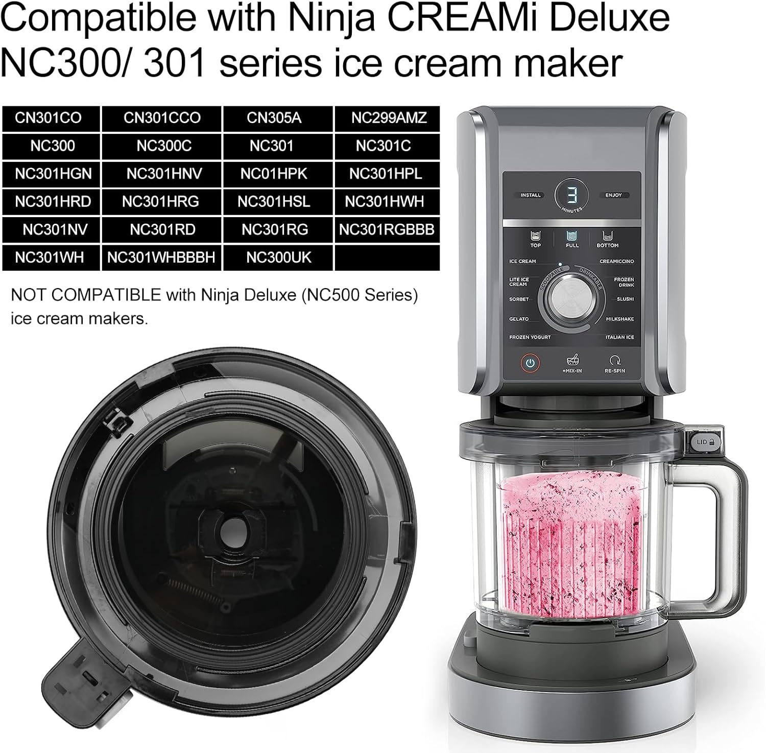 Compatible of our ninja creami lid replacement: This ninja creami lid are ONLY compatible with ninja creami nc300 series ice cream makers ,include CN301CO, CN301CCO, CN305A, NC299AMZ, NC300, NC300C, NC301, NC301C, NC301HGN, NC301HNV, NC01HPK, NC301HPL, NC301HRD, NC301HRG, NC301HSL, NC301HWH, NC301NV, NC301RD, NC301RG, NC301RGBBB, NC301WH, NC301WHBBBH,NC300UK.